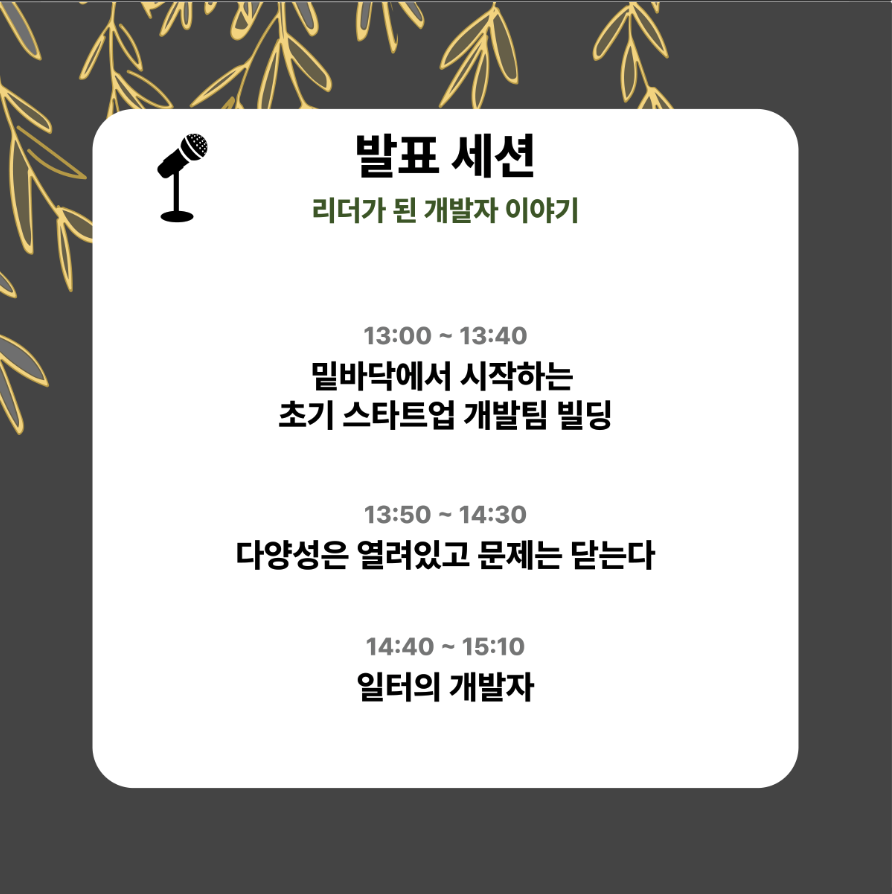 재영님은 팀을 리딩하면서 자신이 어떤 성향을 갖고 있는지 파악하고, 고칠 수 있는 부분은 고치고 고치지 못하는 부분에 대해서는 깊게 생각하지 말고 나는 다른 유형의 사람이다라고 생각하면서 강점을 키워나가라는 말씀을 해주셨다. 말씀을 너무 잘하셔서 따로 스피치학원을 다니셨나 생각이 들 정도였다! 귀에 쏙쏙 박히는 딕션과 그에 알맞는 용어들..! 그리고 리더와 모든 개발자를 응원하는 메세지까지 전해주시는 멋진 발표였다
