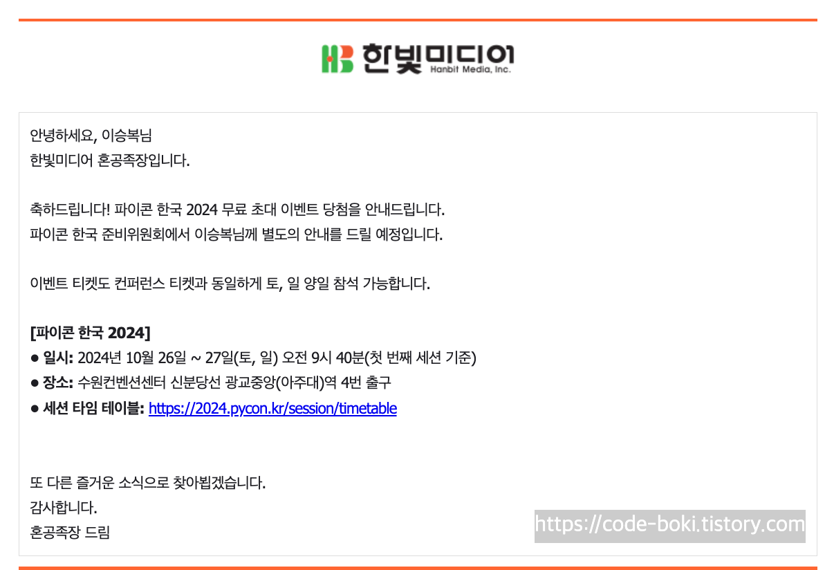 그 중 인프런 스터디원 대상으로 하는 이벤트에는 떨어지고, 한빛미디어에서 파이콘 무료 초대 이벤트에는 당첨됐다