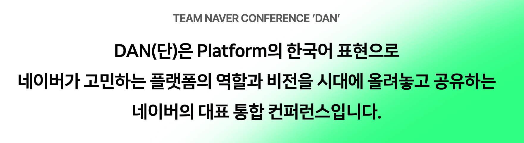 팀네이버 컨퍼런스 DAN 24는 네이버의 비즈니스 전략과 기술, 크리에이티브, 그리고 다양한 경험의 전문성을 유기적으로 연결하여 네이버가 앞으로 만들어나갈 비즈니스, 서비스의 변화 방향을
