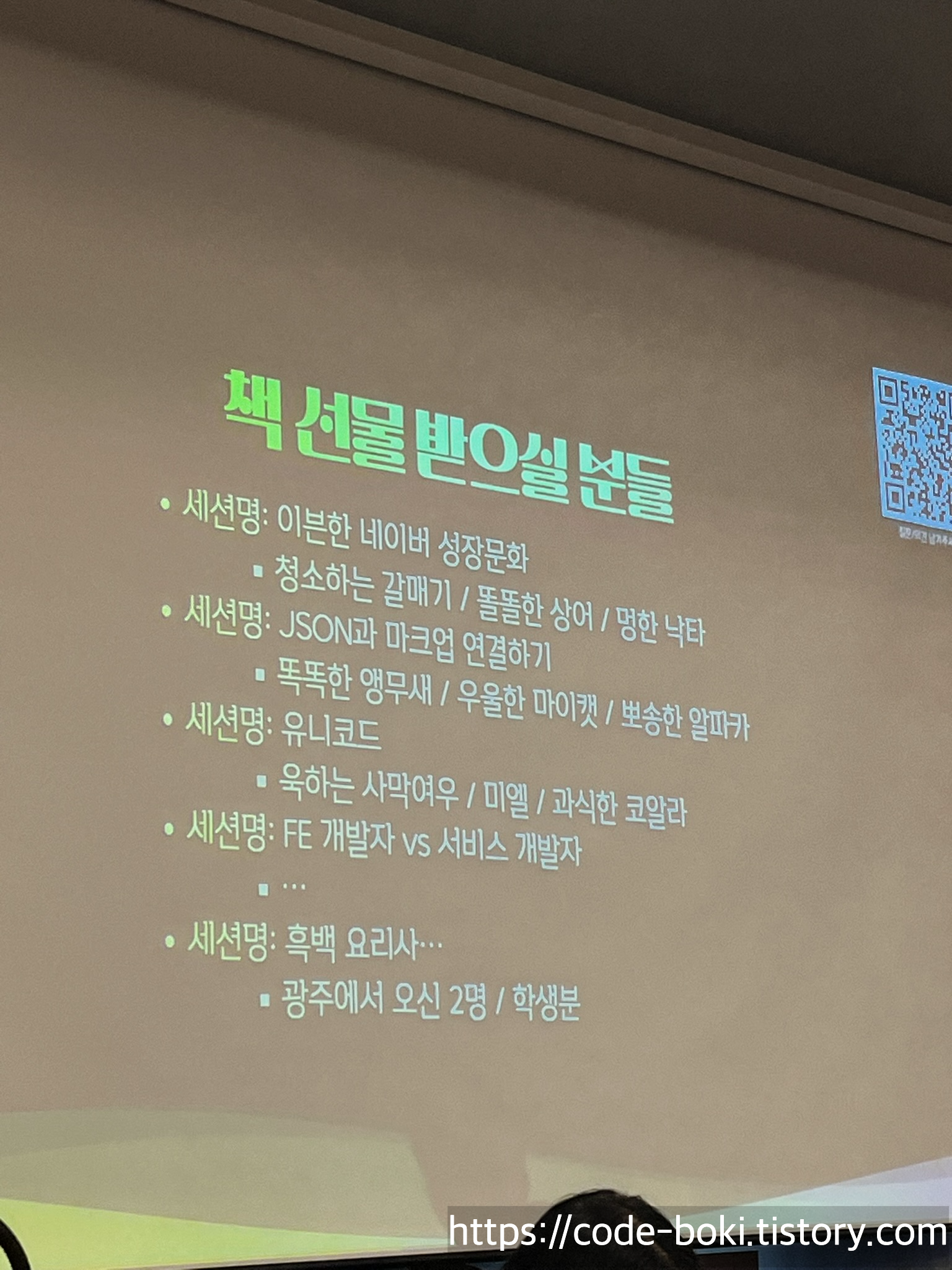 이후에는 책 선물을 해주는 시간이 있었다. 발표세션/패널토크 중간중간 네이버 채팅으로 질문들을 받았는데.. 그 질문중에서 인상깊었던 질문을 해준 익명유저를 연사자분이 뽑는 것이었다