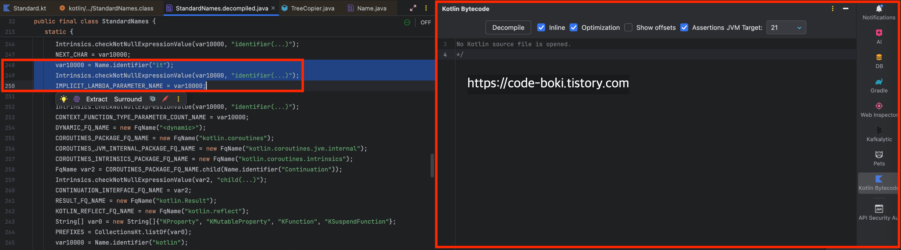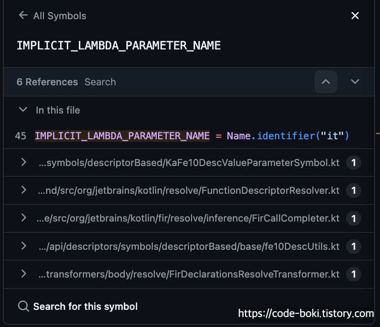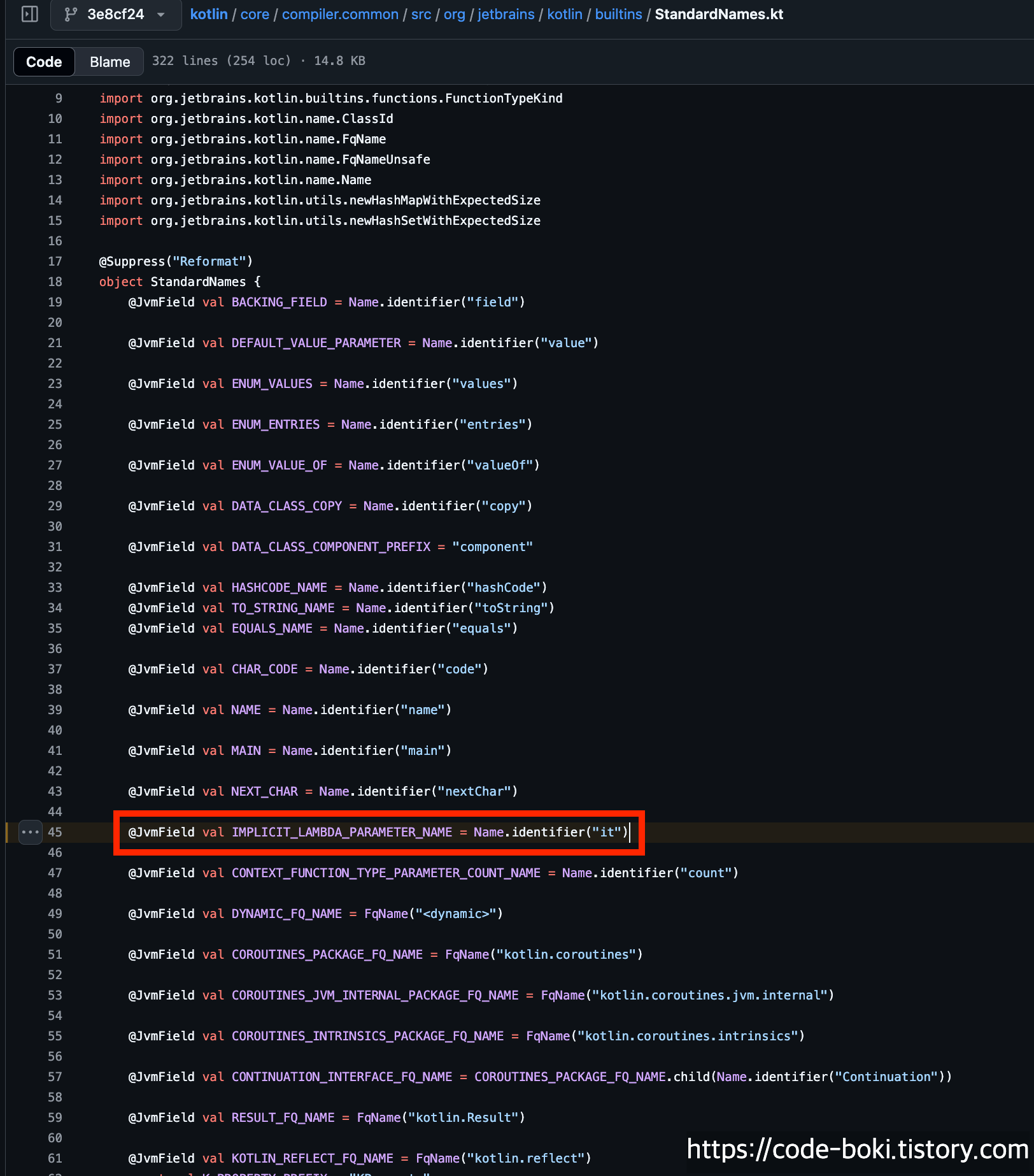 어쨌든, 여기에서 StandardNames라는 object를 살펴봤는데, 내부에 IMPLICIT_LAMBDA_PARAMETER_NAME 키워드를 찾아볼 수 있었다