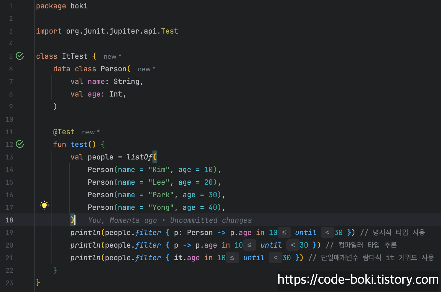 println(people.filter { p: Person -> p.age in 10 until 30 }) // 명시적 타입 사용