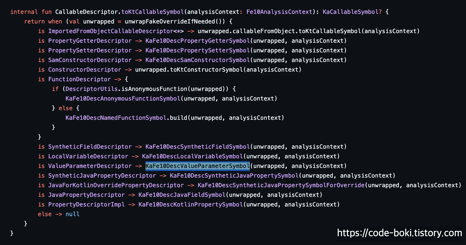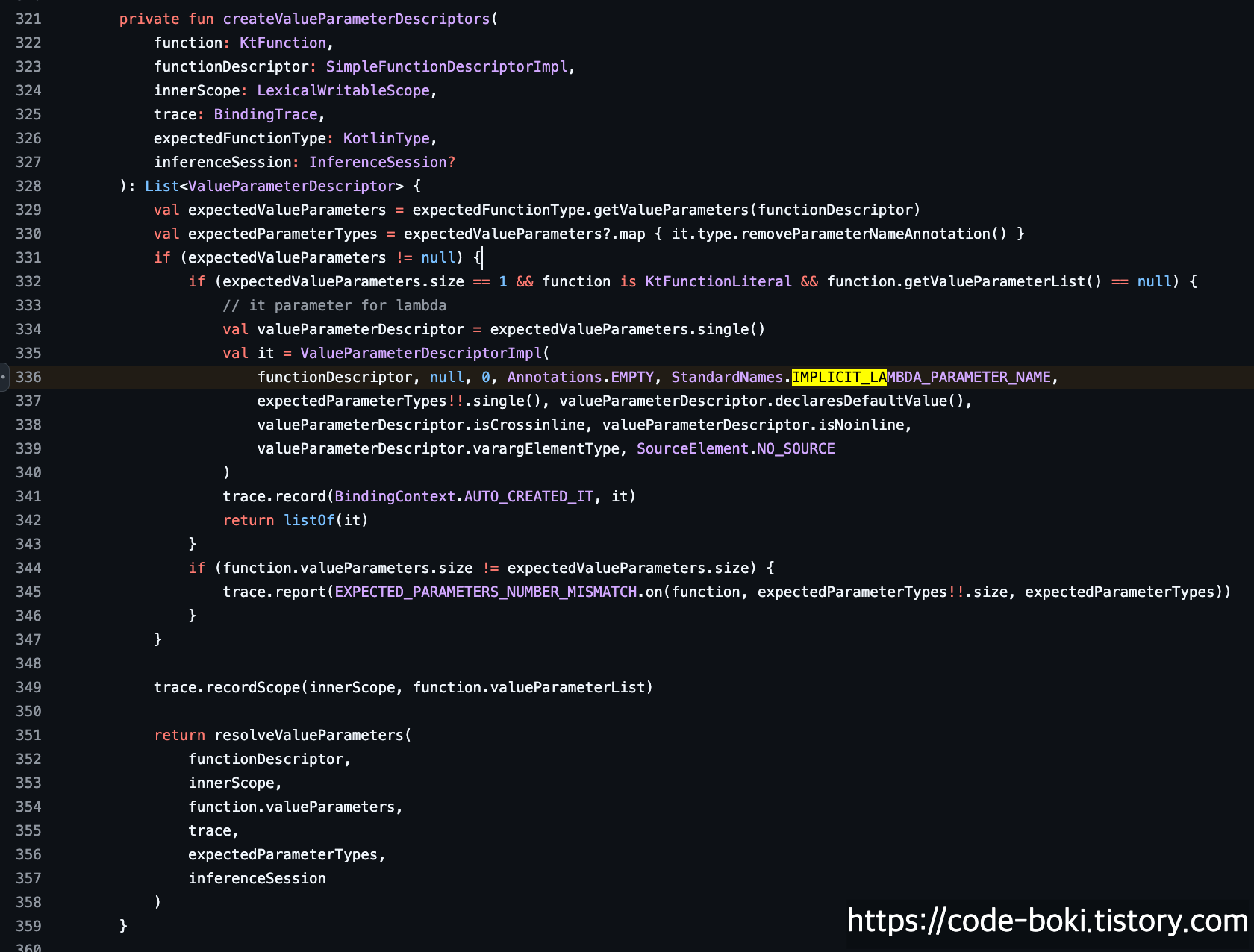 이후 컴파일러 내부의 동작을 보면 FunctionDescriptorResolver의 createValueParameterDescriptors 메서드는 파라미터를 확인하며 파라미터가 단 하나이고, 사용자가 변수명을 지정하지 않은 경우를 체크해 해당 파라미터에 it이라는 이름을 부여하는 역할을 수행한다