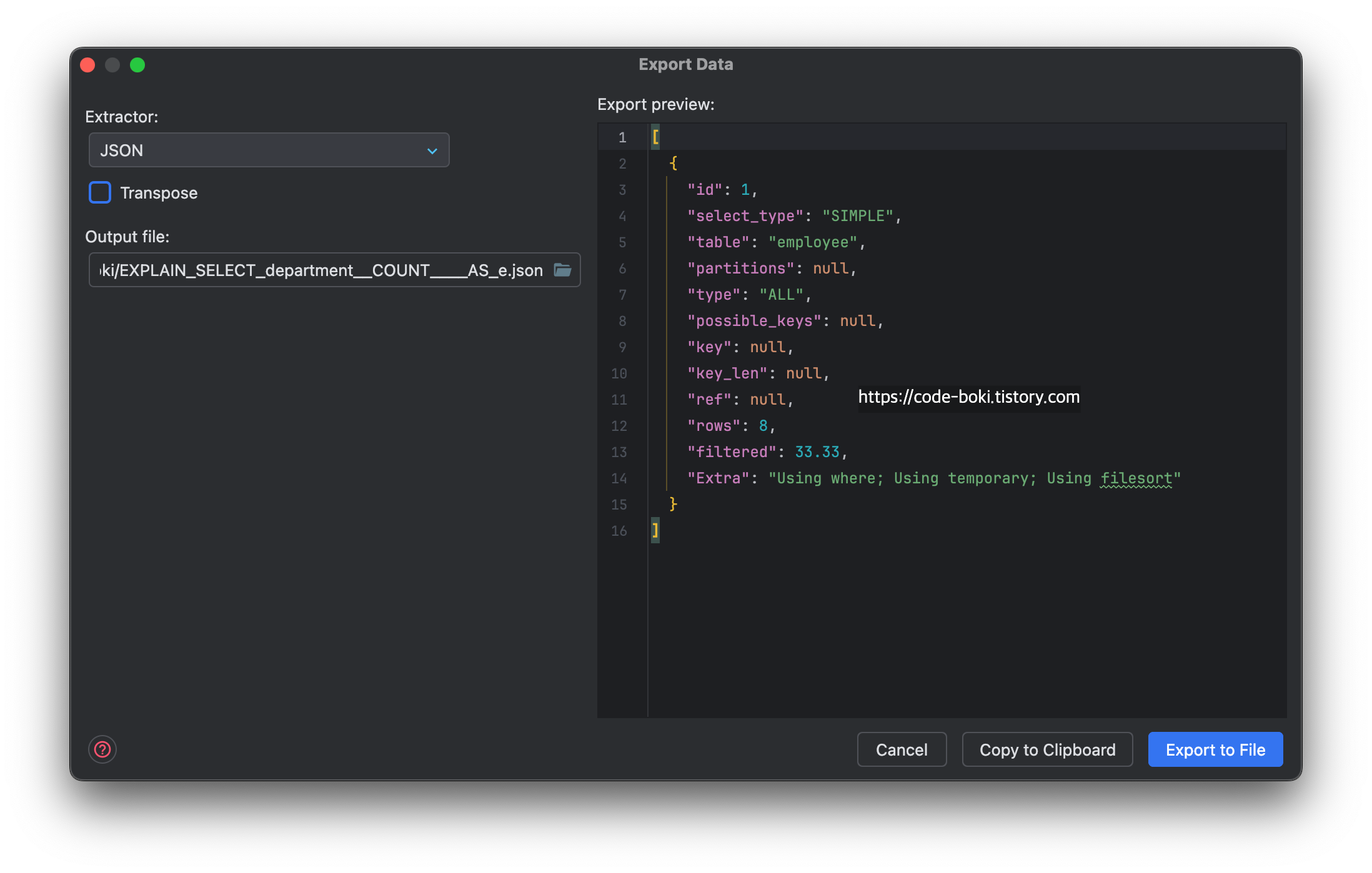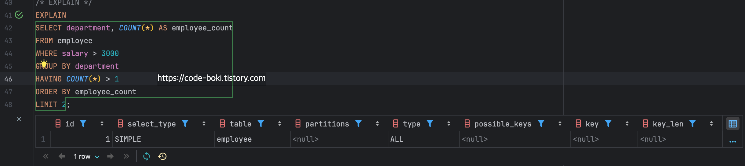 - Extra: where 조건 사용, group by와 having에서 임시테이블 사용, order by절에서 정렬 수행 시 인덱스를 사용하지 않고 별도의 정렬작업(filesort)를 수행함 정도로 분석할 수 있다