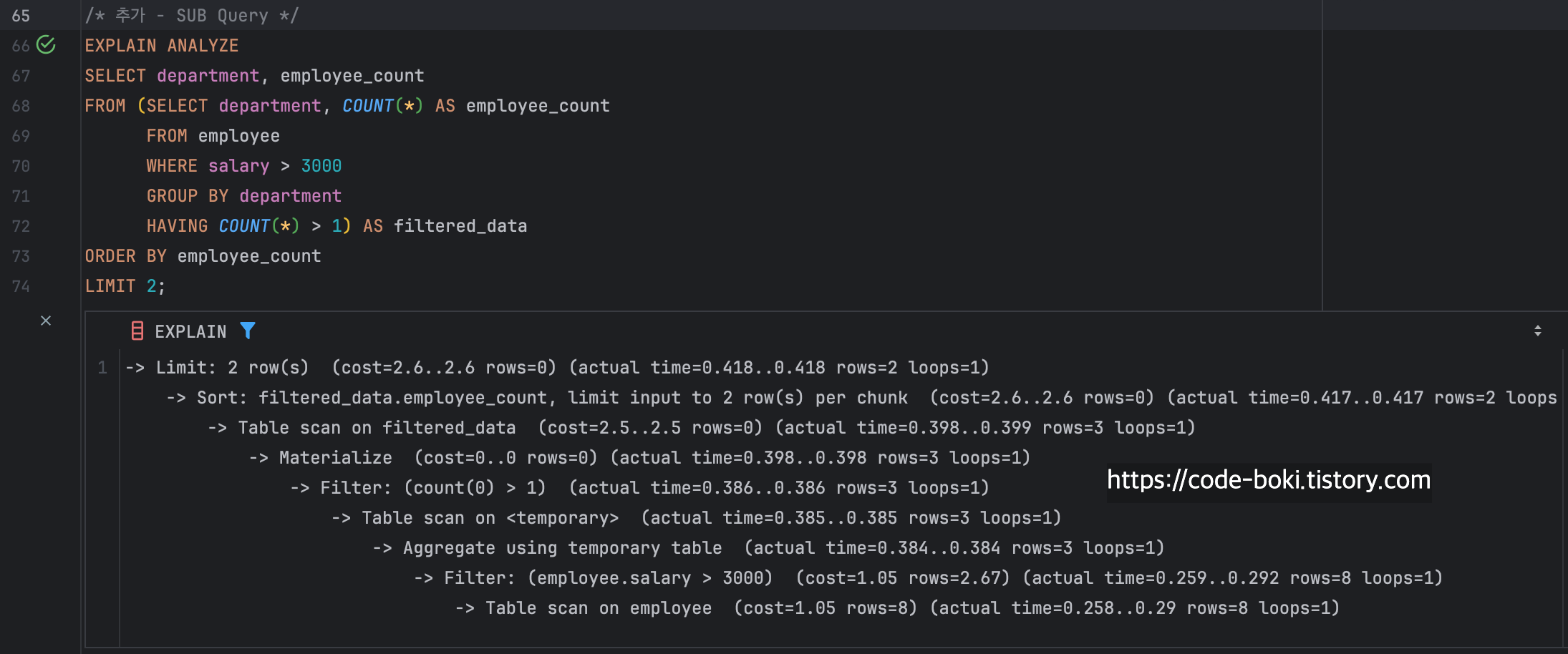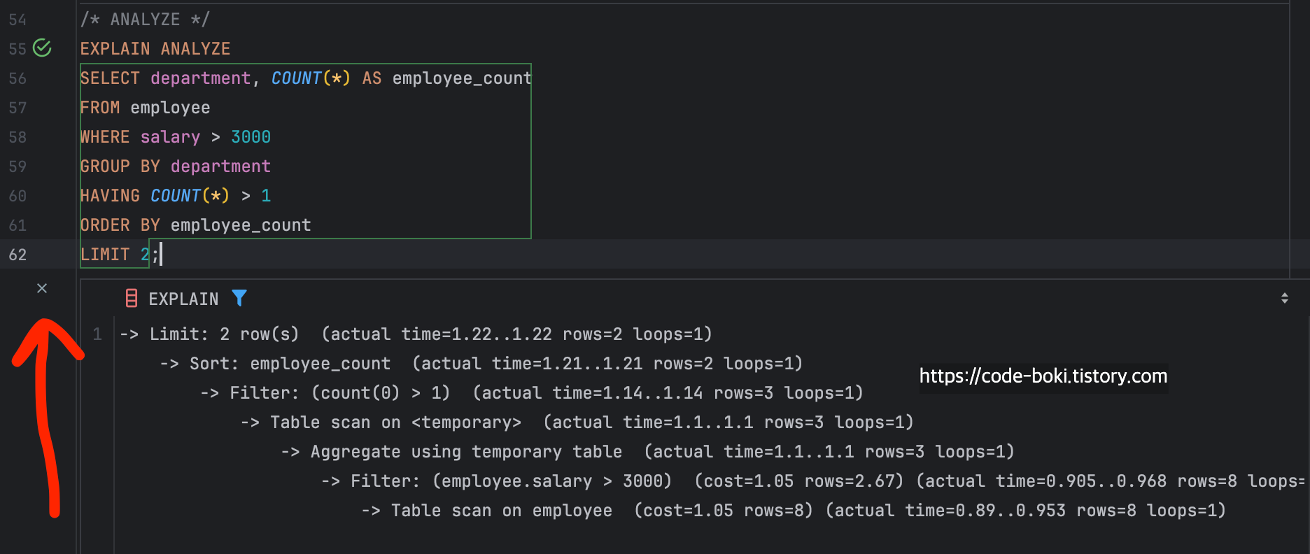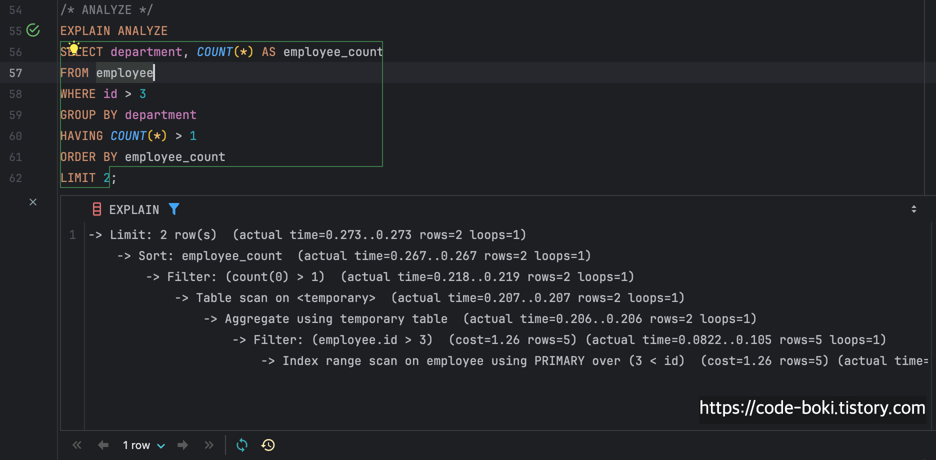 이 결과는 옵티마이저의 예측결과이며, 실제로 실행된 쿼리를 기반으로 결과를 제공받으려면 ANALYZE 키워드를 사용해야 한다