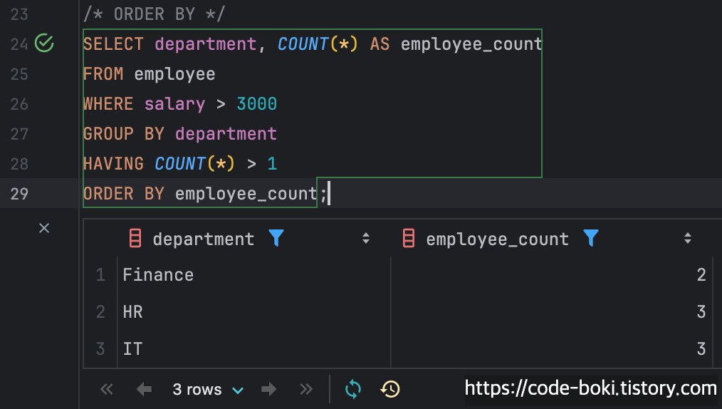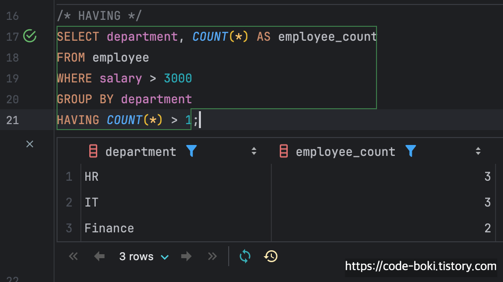 사실 결과는 똑같다. HAVING의 조건을 > 1에서 > 2로 바꾸면 달라지겠지만 그냥 임시로 이렇게 해봤다