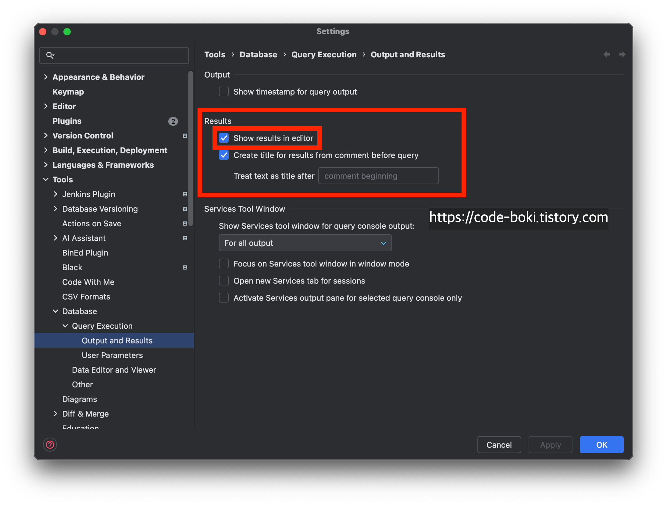 * 쿼리 실행결과가 에디터 내부에 나오도록 설정을 바꿔놨다