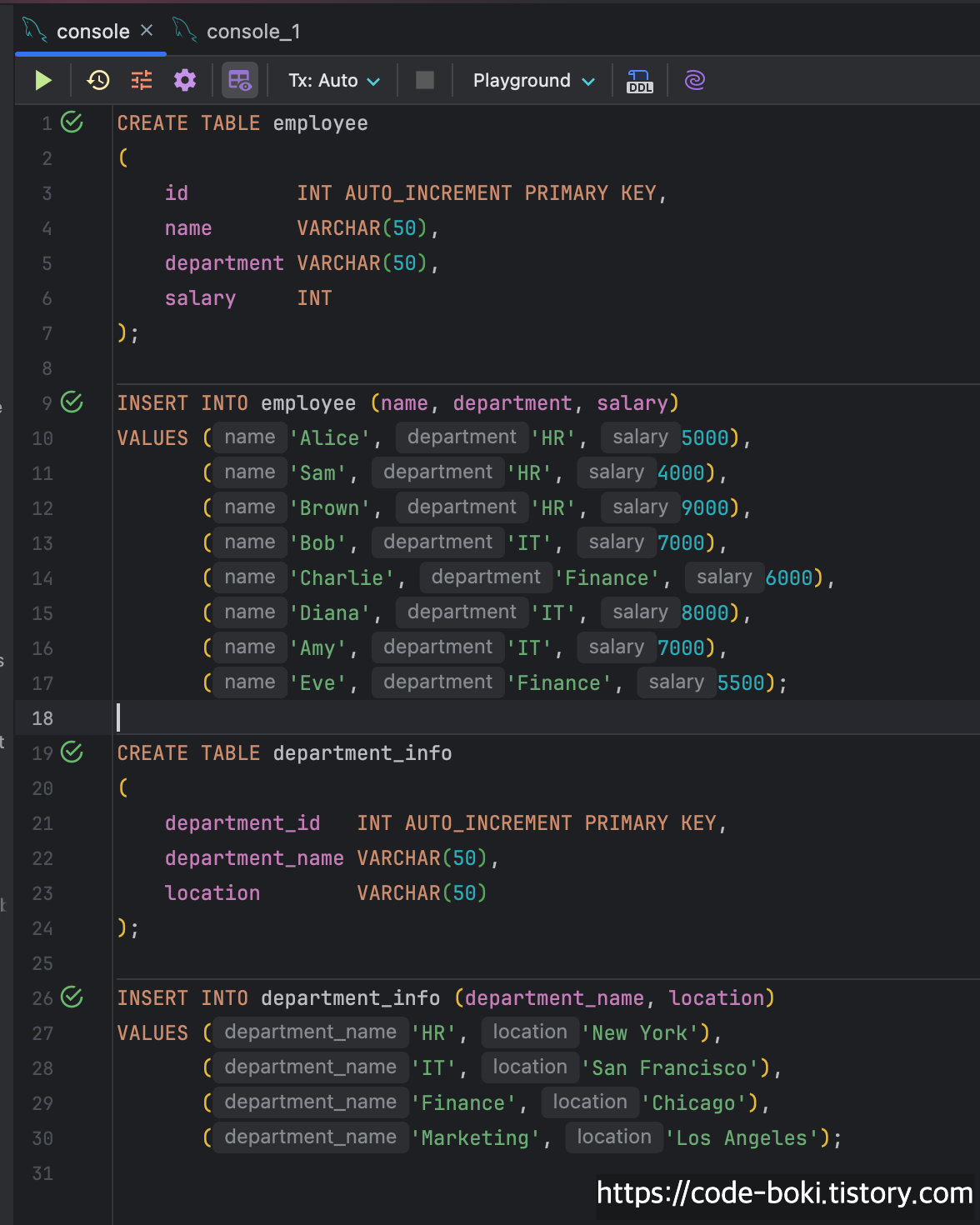 일단 이걸 검증하기 위한 employee, department_info 테이블 2개를 만들었다