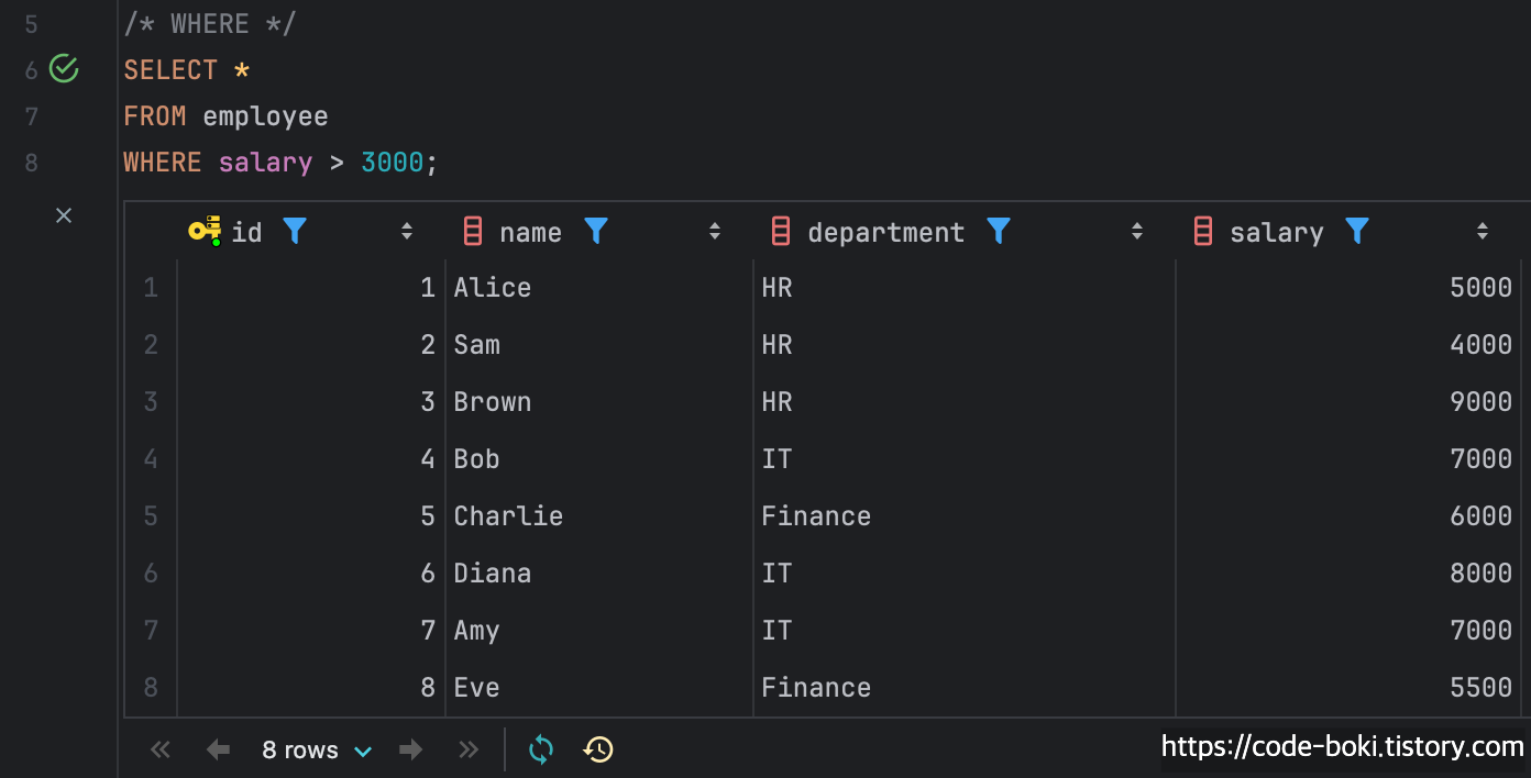 -> Filter: (employee.salary > 3000) (cost=1.05 rows=2.67) (actual time=0.259..0.292 rows=8 loops=1)