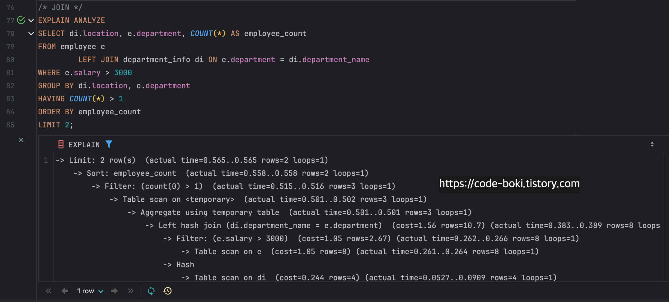 어떤 단계에서는 cost, rows도 볼 수 있는데 이 비용에 대한 것은 추후에 다룰 예정이다..!