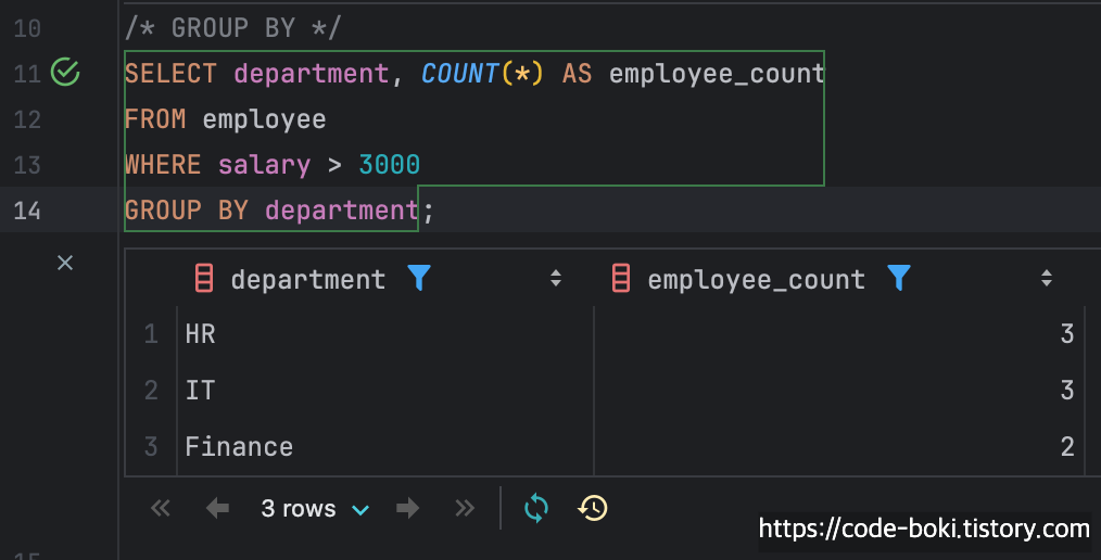 - SELECT: SELECT department, COUNT(*) AS employee_count