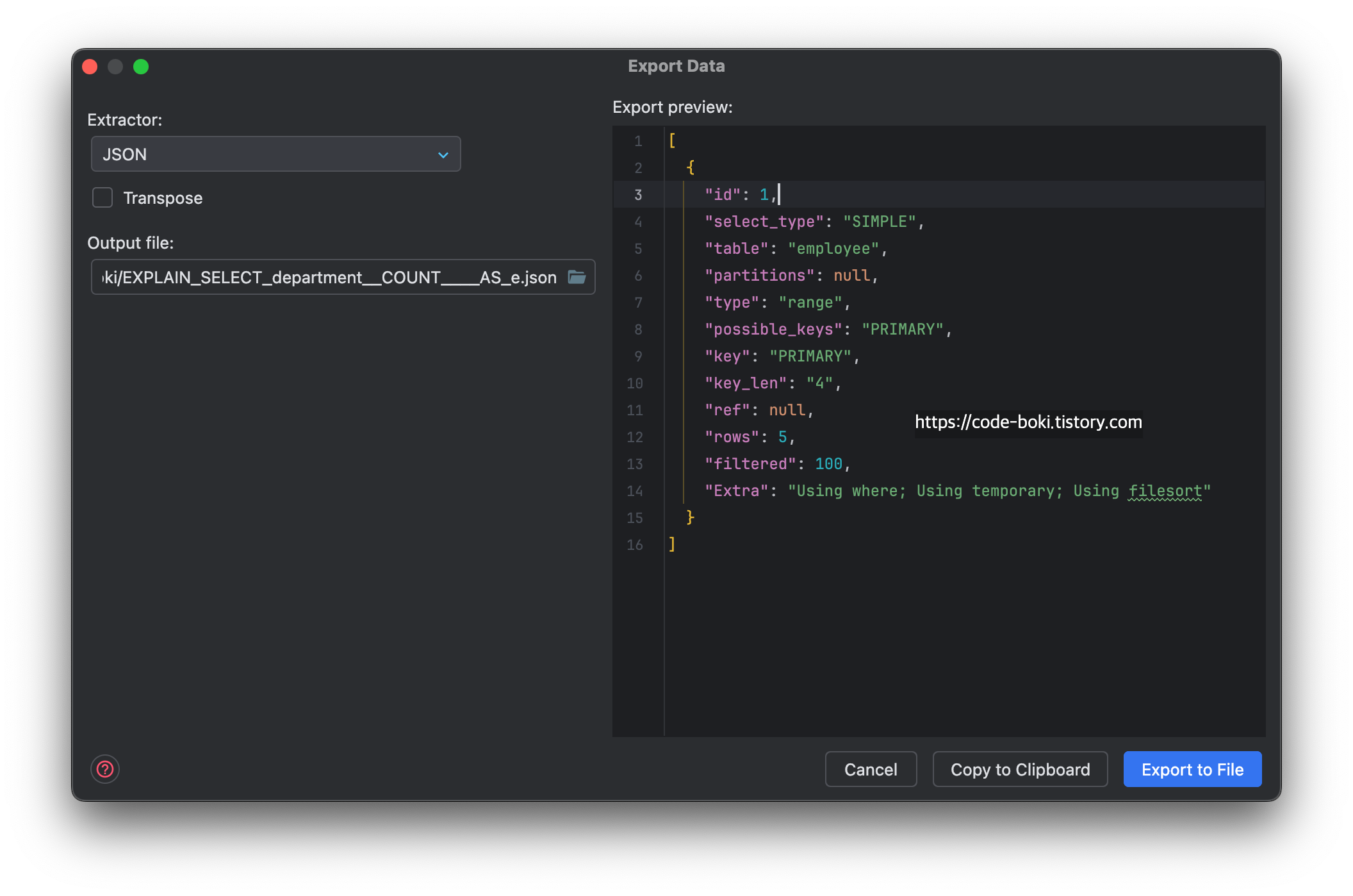 - Extra: 옵티마이저가 SQL 쿼리를 분석한 후의 실행 계획을 수립한 과정 중 추가적인 작업에 대한 설명