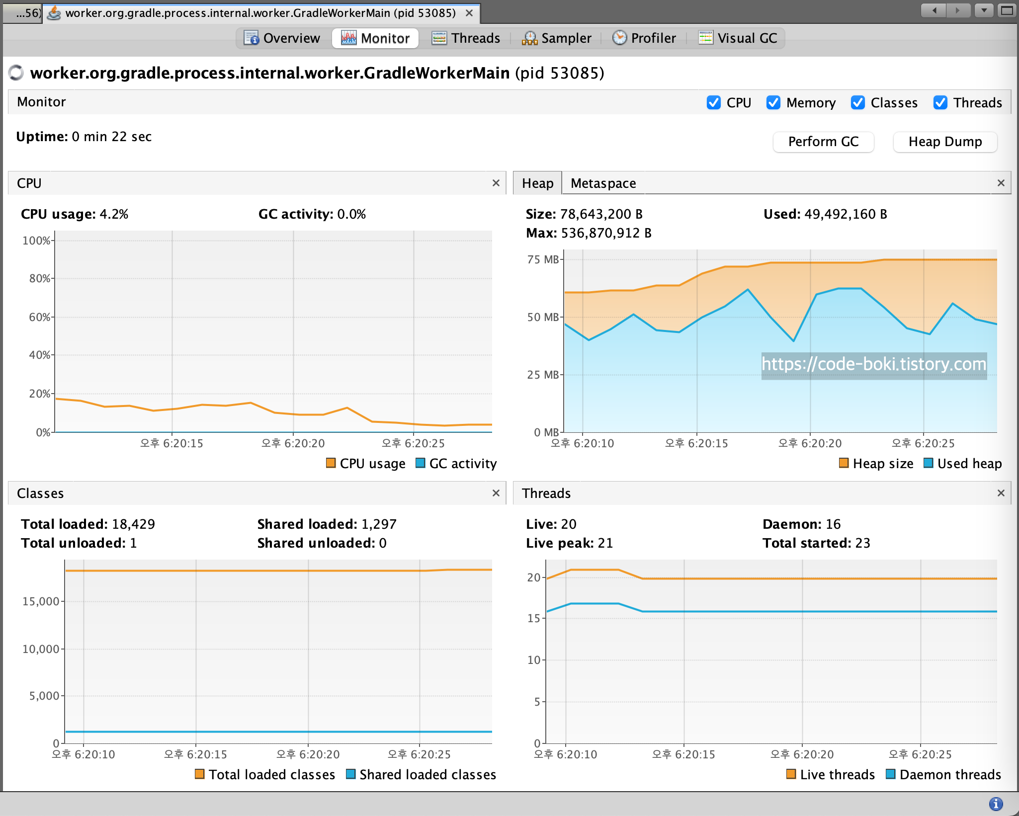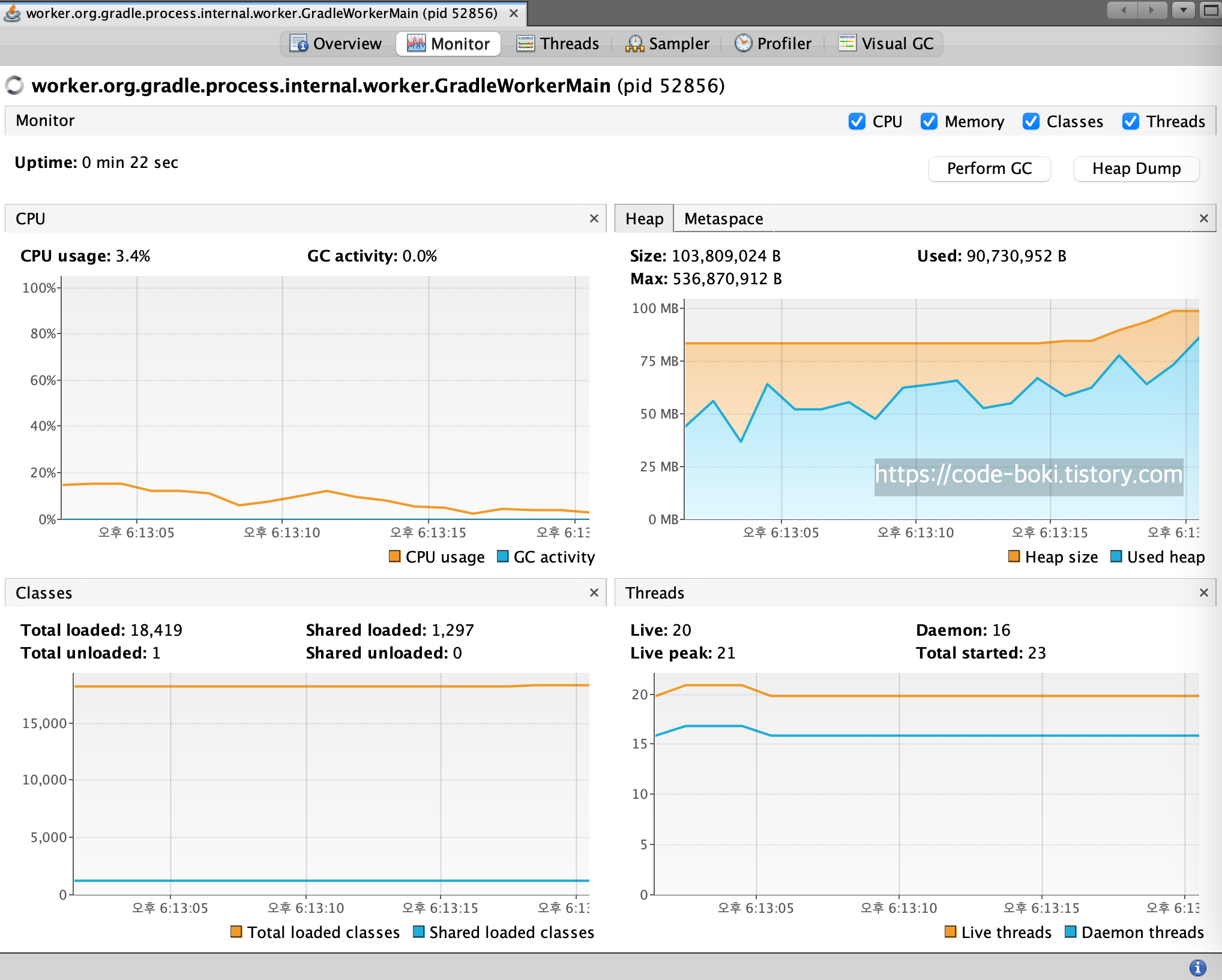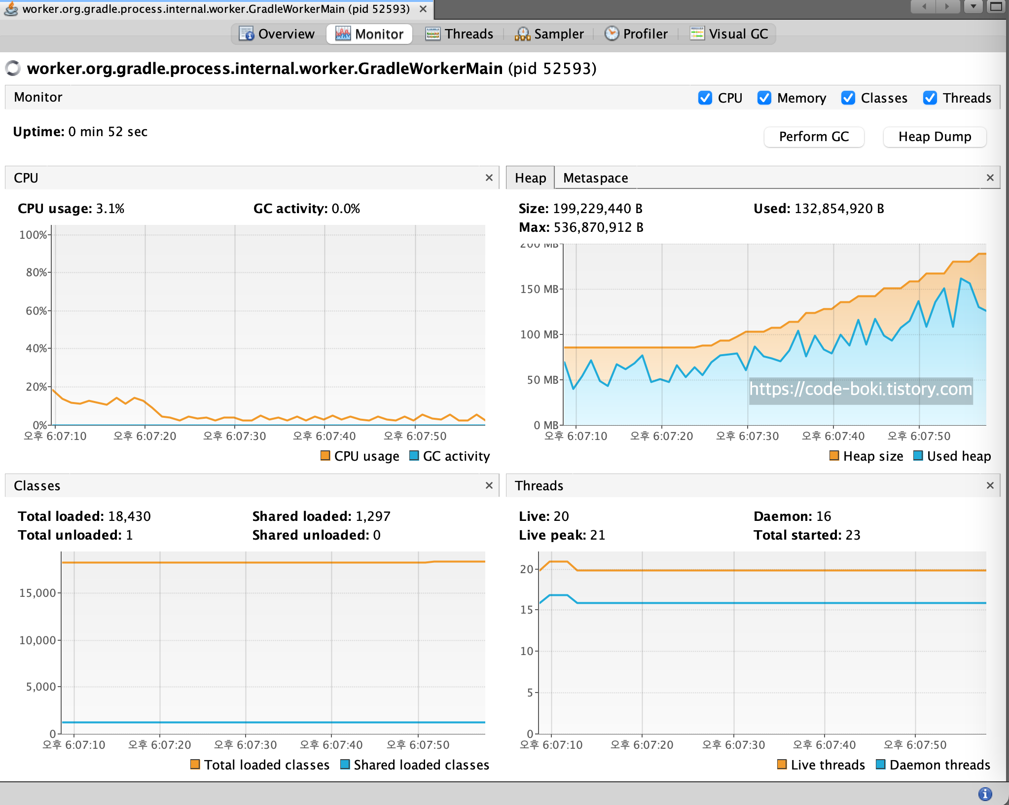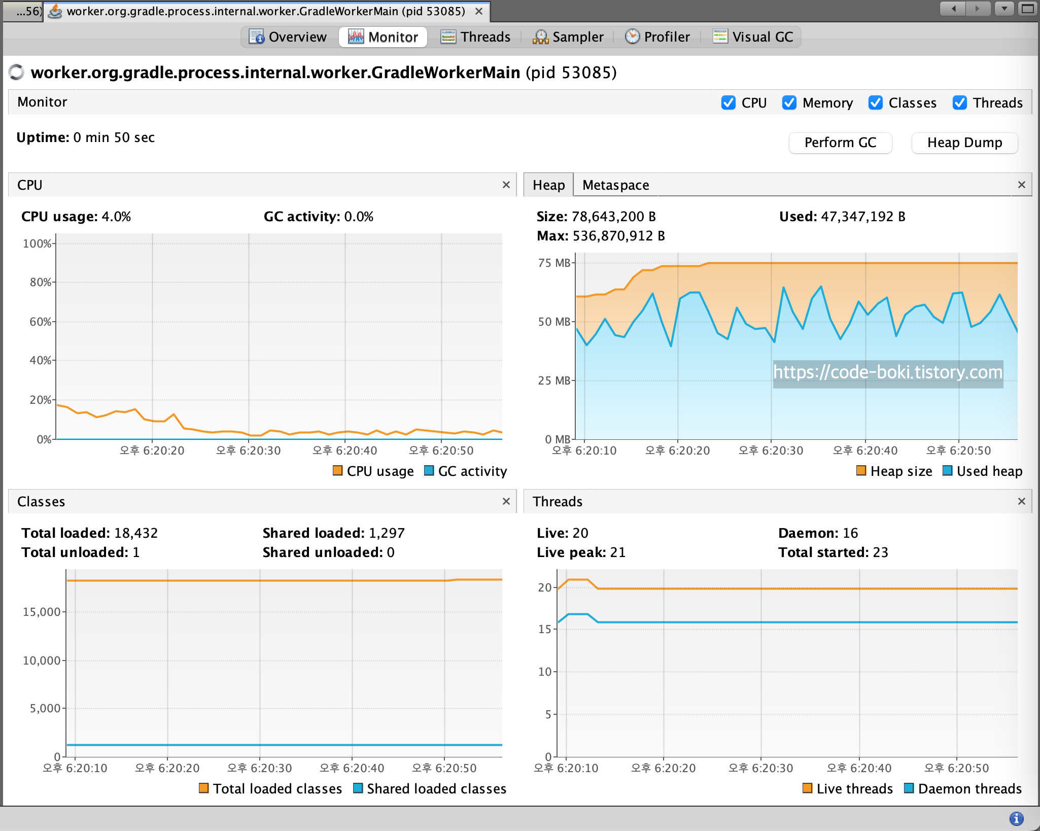 그렇기때문에 VisualVM에서 GradleWorker로 출력이 되는 모습을 볼 수 있다
