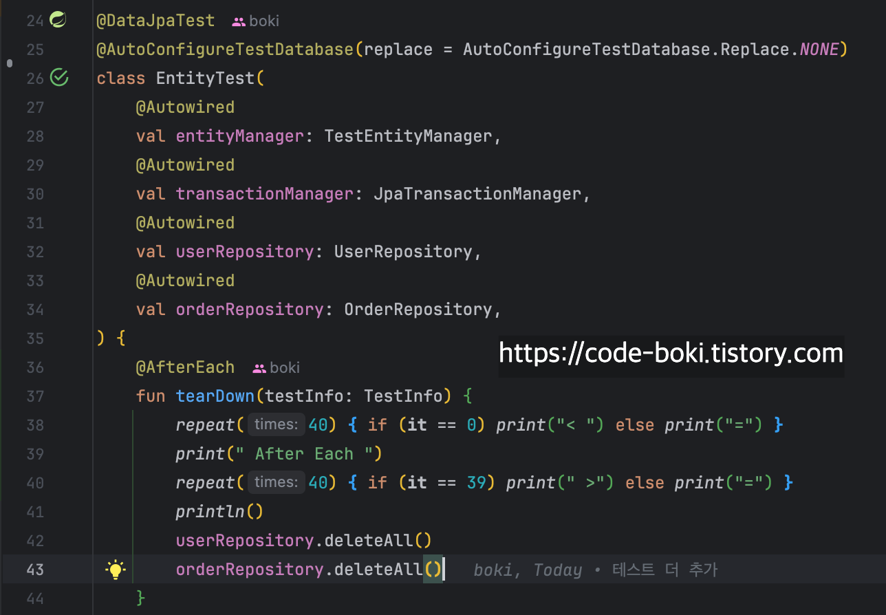 - @AfterEach에서는 로깅 라이브러리보다는 간단하게 테스트쿼리와 구분되게 print 출력을 담당하고 마지막으로 테이블을 비우는 작업을 담당했다