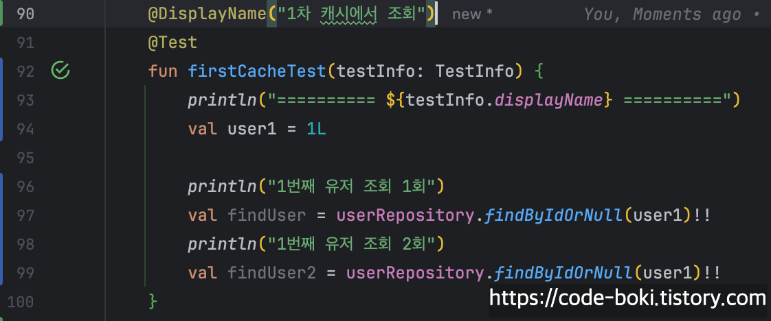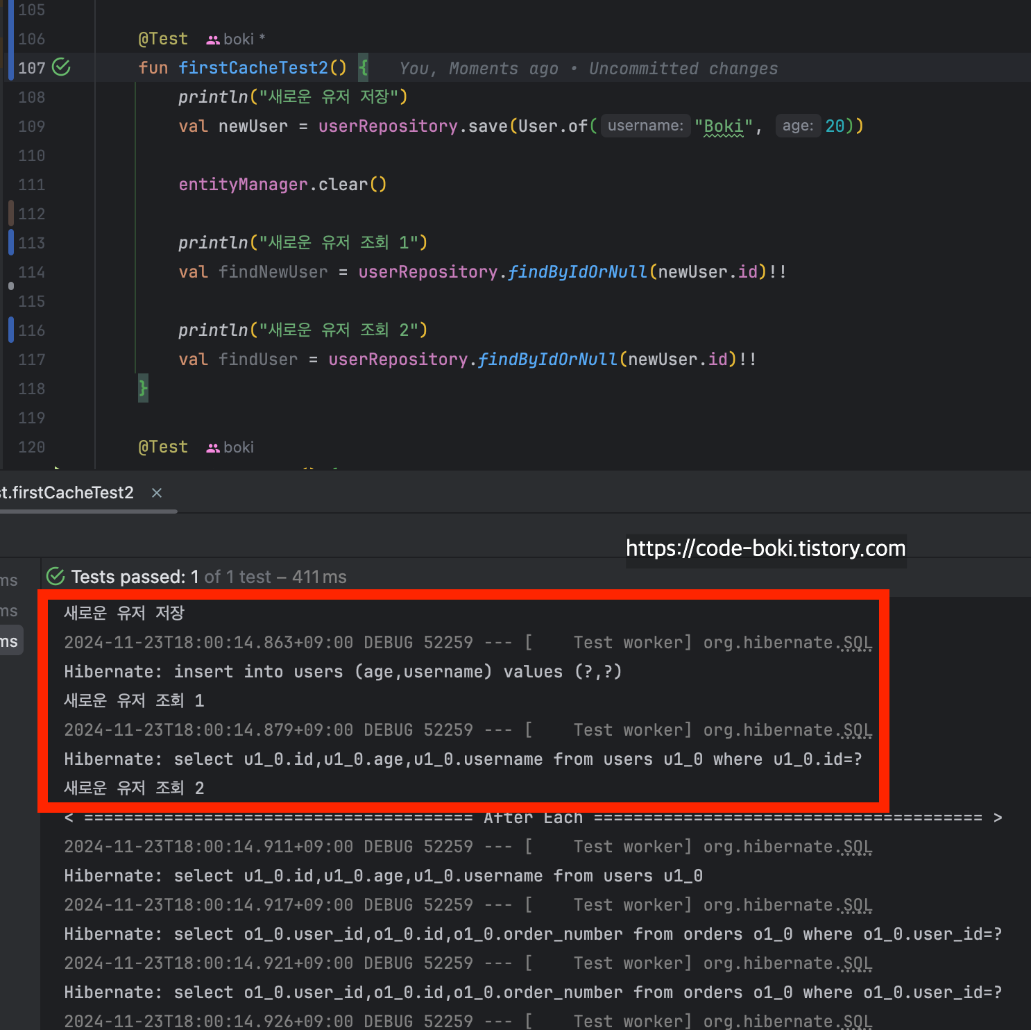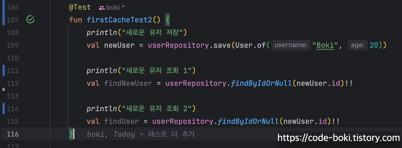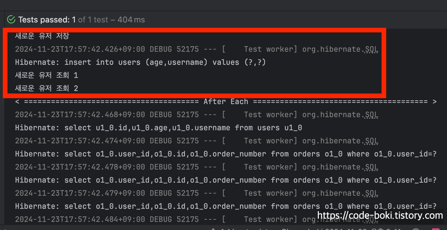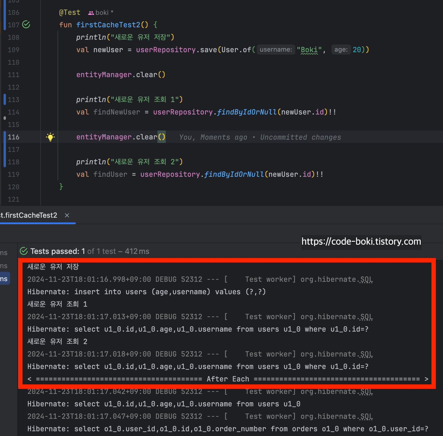이번에는 기존에 저장된 엔티티가 아니라 새로 저장한 엔티티로 검증해봤다
