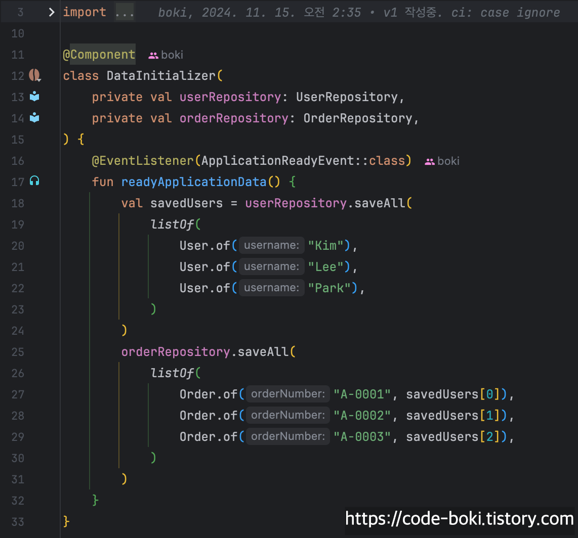 - Spring 컨테이너가 다 뜨고 난 후(DataSource, TransactionManager, EntityManager, JPA 관련 빈들 AOP 후처리 등)에 User와 Order 테스트 데이터를 3개정도 넣어줬다. save()와 saveAll()에는 @Transactional이 붙어있어 굳이 추가하진 않았다