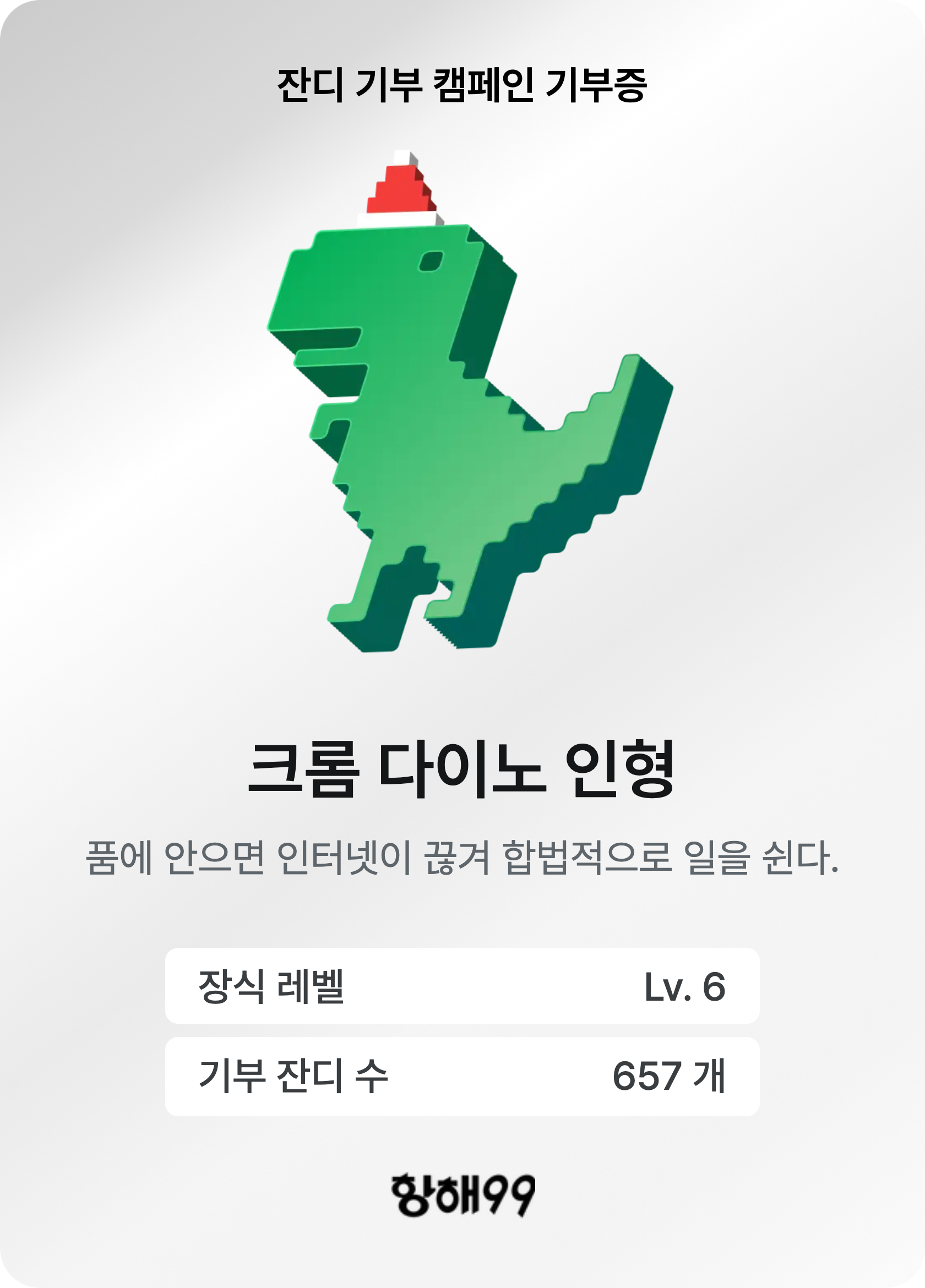 구글처럼 오프라인이 됐을 때 공룡게임을 할 수 있는 귀여운 크롬 다이노 인형을 받았다