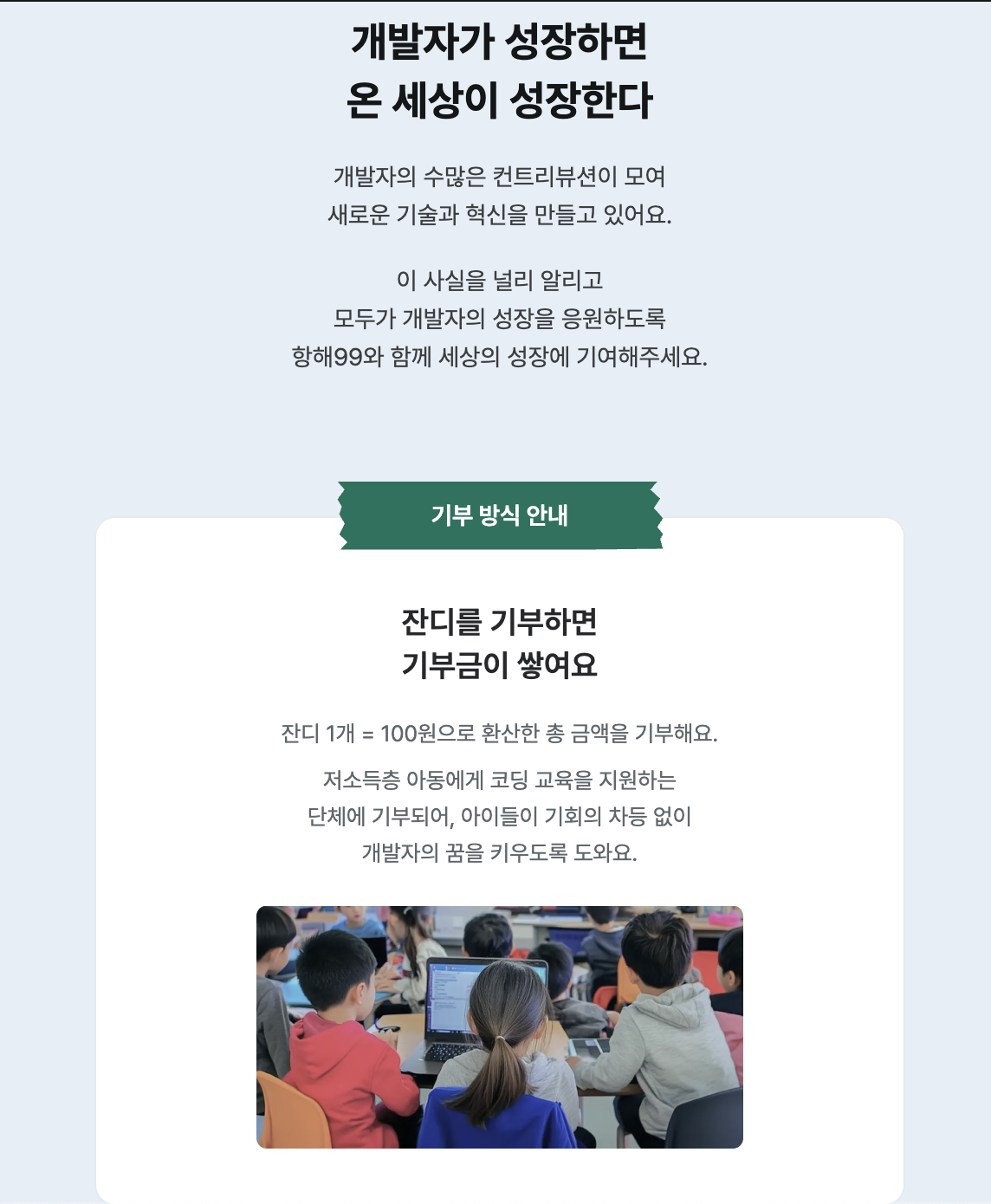항해99에서 잔디1개=100원 으로 환산해서 모아진 총 금액을 저소득층 아동을 위한 코딩교육 지원 단체에 기부하는 잔디 기부 캠페인을 열었다