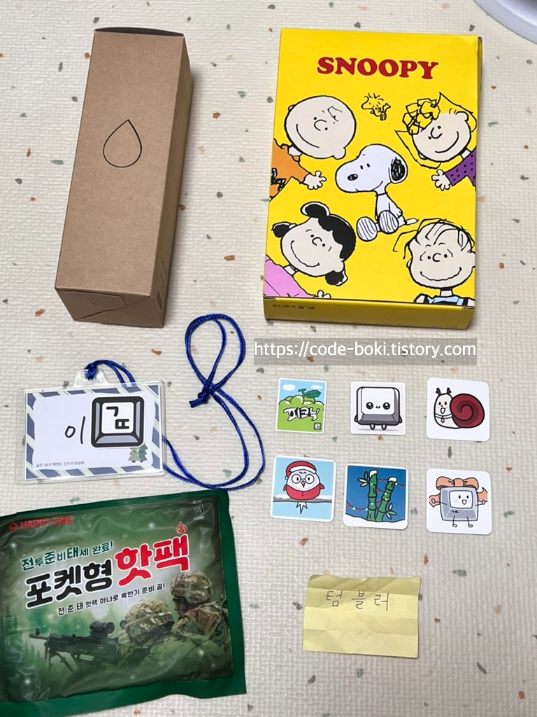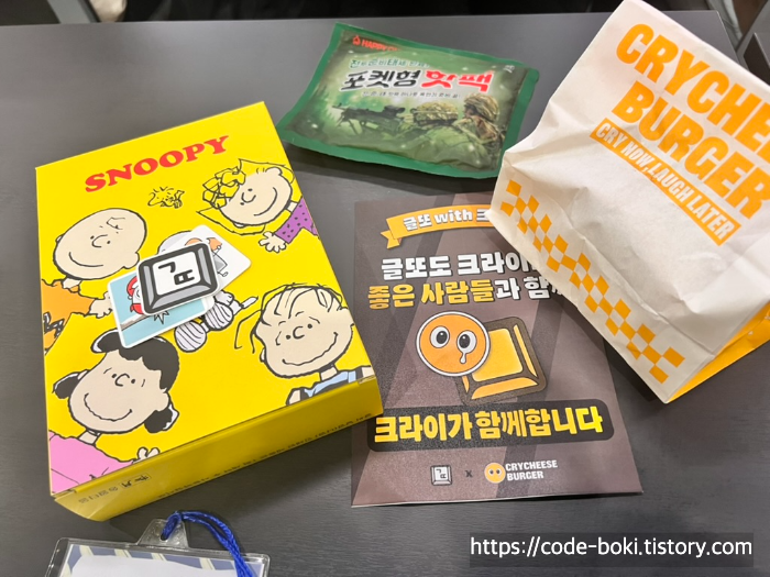 입구에서 이름이 적힌 목걸이와 초초 귀여운!!! 글또 스티커, 핫팩, 스누피 모양의 박스와 햄버거를 받았다