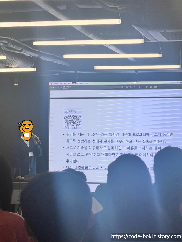 첫번째 발표가 커리어에 대한 내용, 두번째는 리팩토링(개발)에 대한 내용이었다면 마지막 발표는 살짝 철학적인? 프로그래머의 태도와 습관에 관한 내용이었다