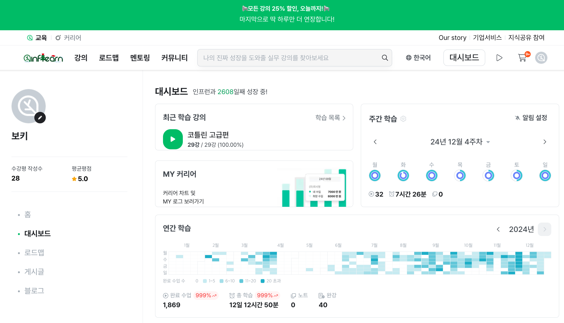 # 24년 인프런 대시보드(강의 수강 기록)