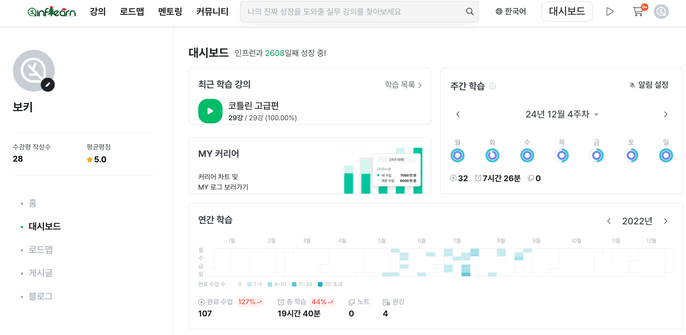 # 22년 인프런 대시보드(강의 수강 기록)
