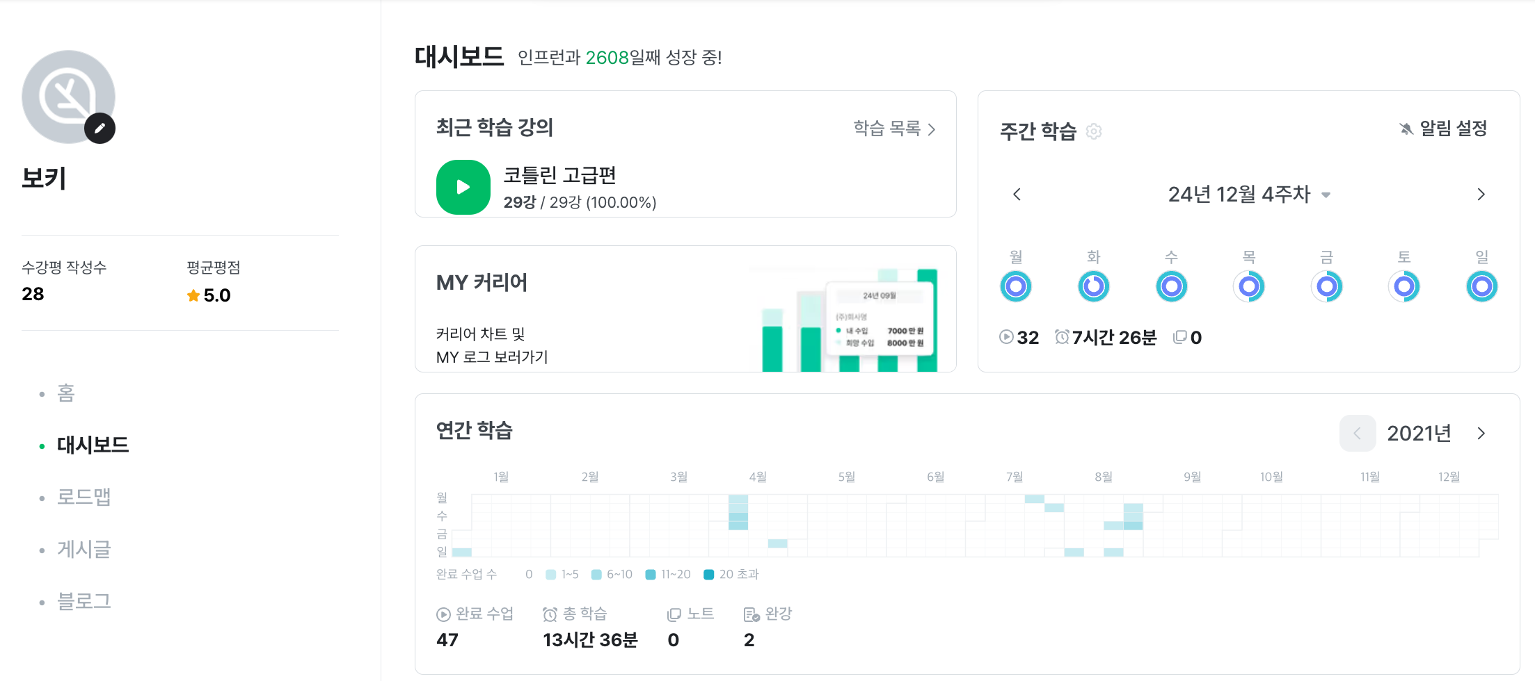 # 21년 인프런 대시보드(강의 수강 기록)