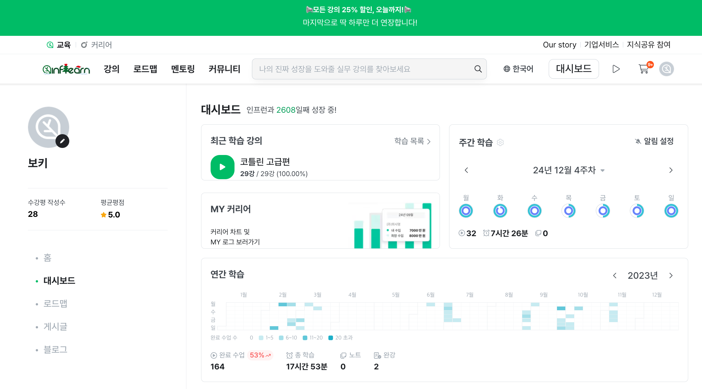 # 23년 인프런 대시보드(강의 수강 기록)