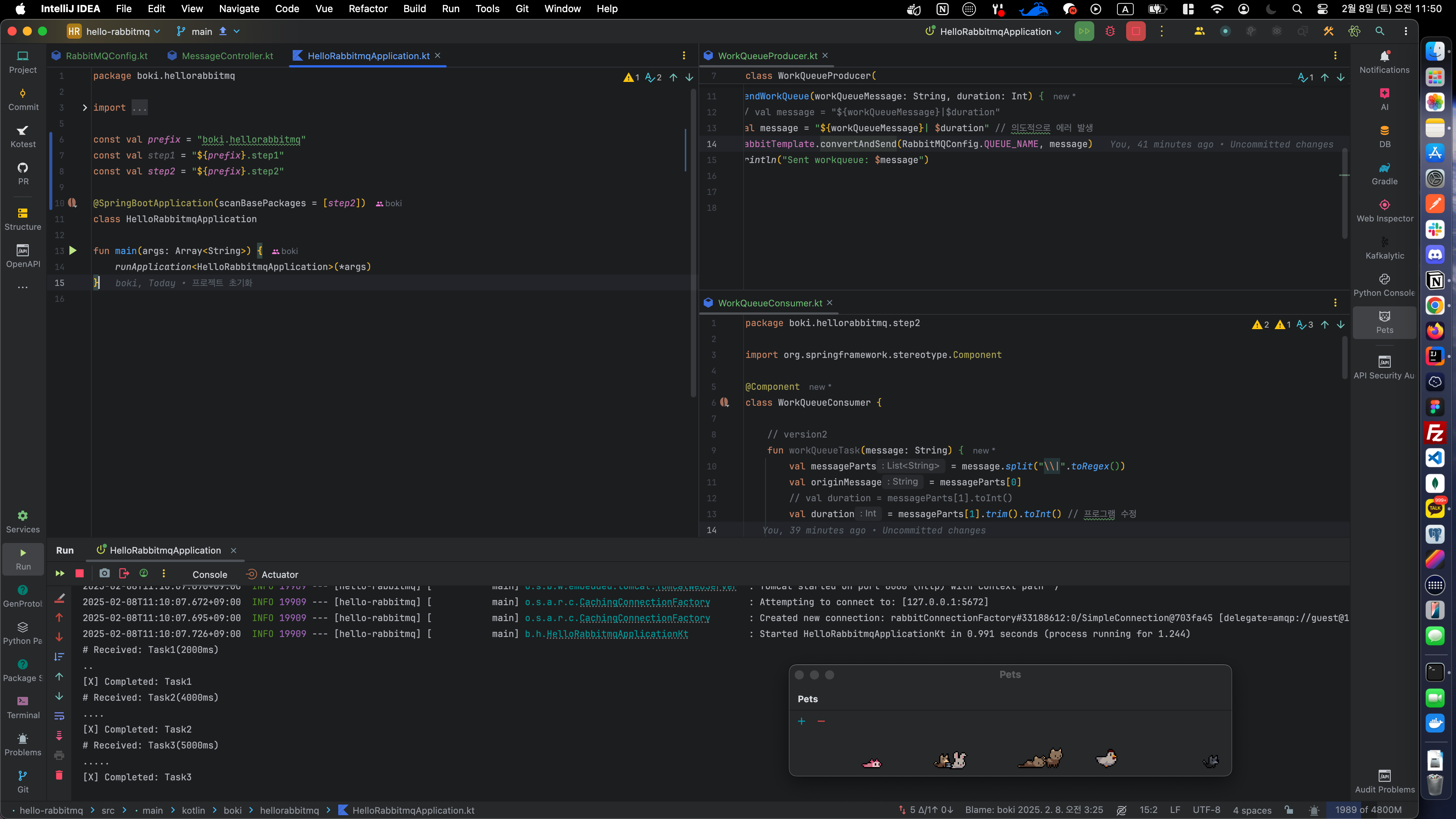 최근에는 RabbitMQ를 수강하며 공부해보고 있다. 강의는 Java지만 Kotlin으로 만들어가며, 코드를 제공해주지만 어차피 자바라 내가 직접 쳐보면서 하고 있다. 또한 Branch 단위로 제공하는 걸 그냥 Config를 교체하는 식으로(학습용이니) 진행중이다.