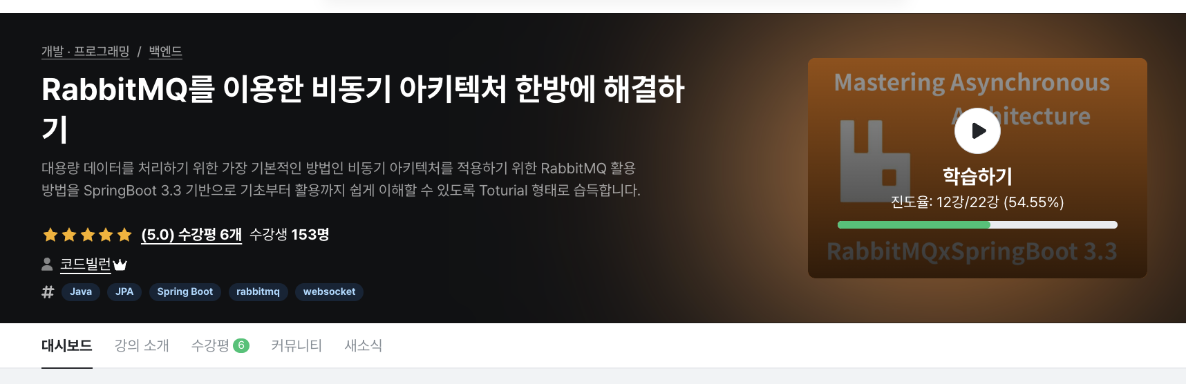 최근에는 RabbitMQ를 수강하며 공부해보고 있다. 강의는 Java지만 Kotlin으로 만들어가며, 코드를 제공해주지만 어차피 자바라 내가 직접 쳐보면서 하고 있다. 또한 Branch 단위로 제공하는 걸 그냥 Config를 교체하는 식으로(학습용이니) 진행중이다.