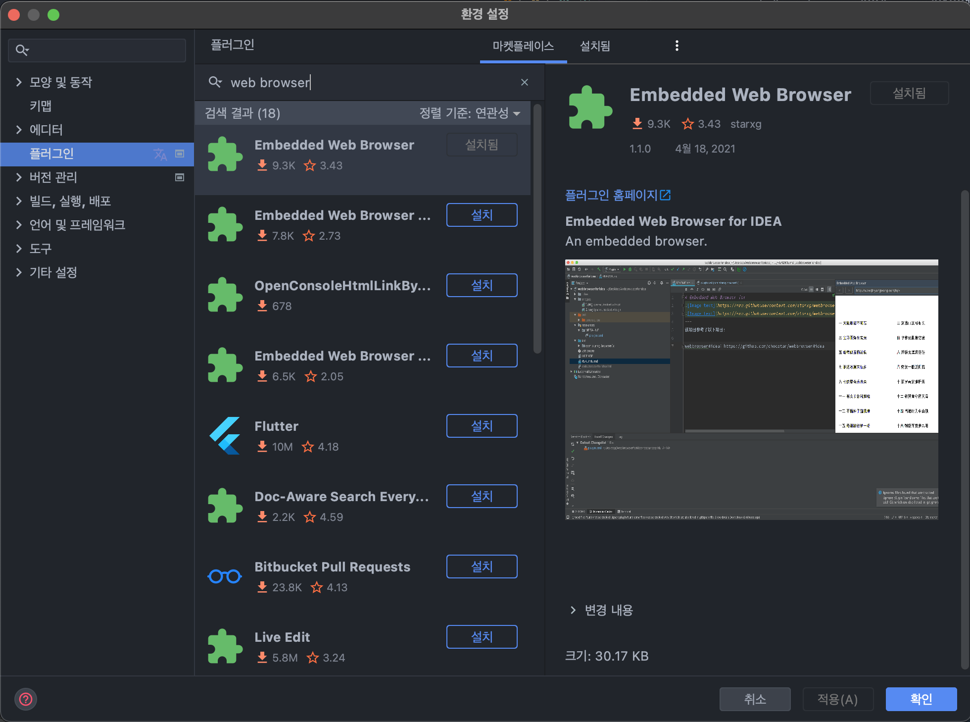 인텔리제이 설정창에서 플러그인 탭을 누르시고 web browser를 검색하시면 embedded web browser가 나옵니다! 이거를 설치하면