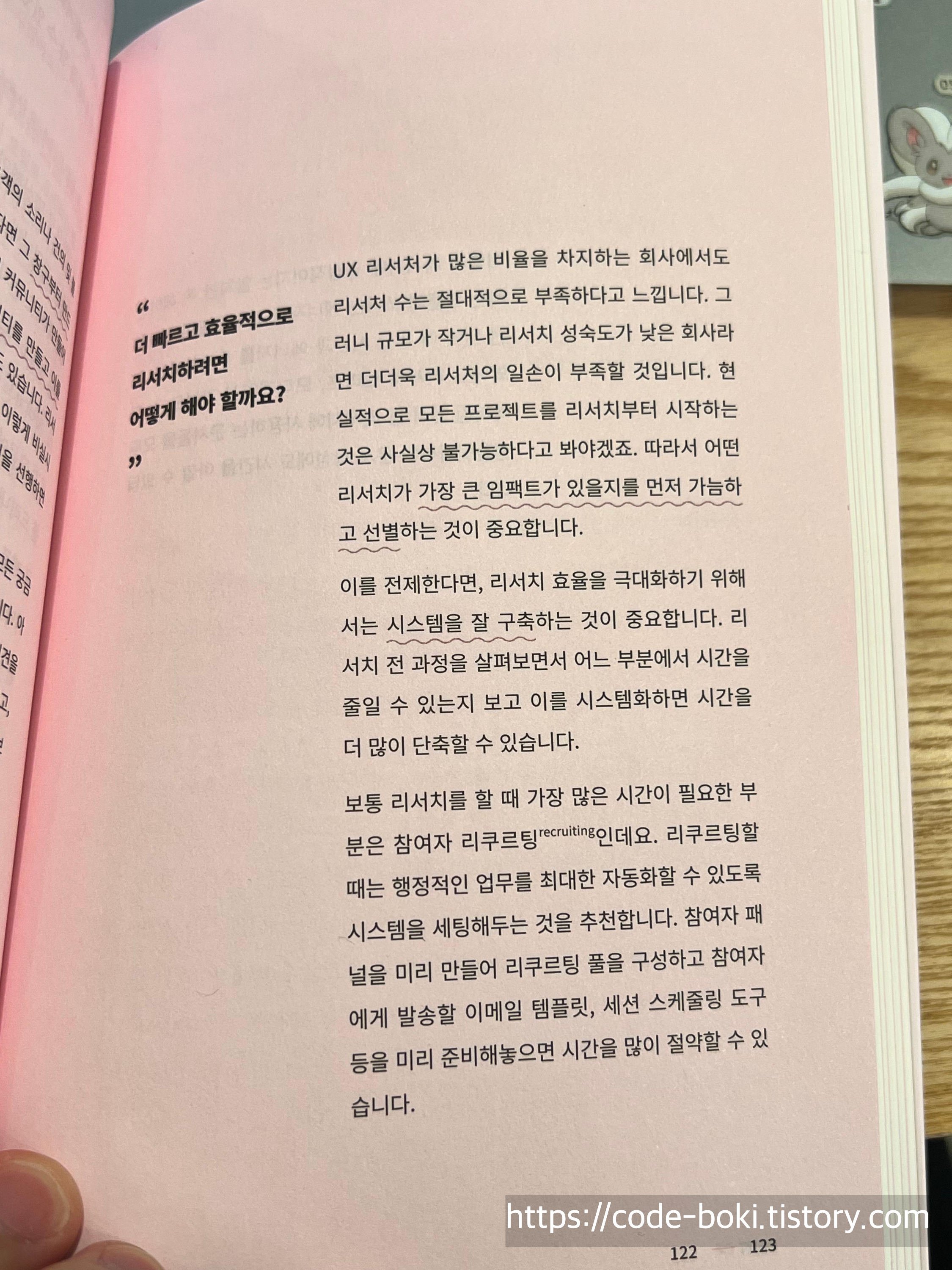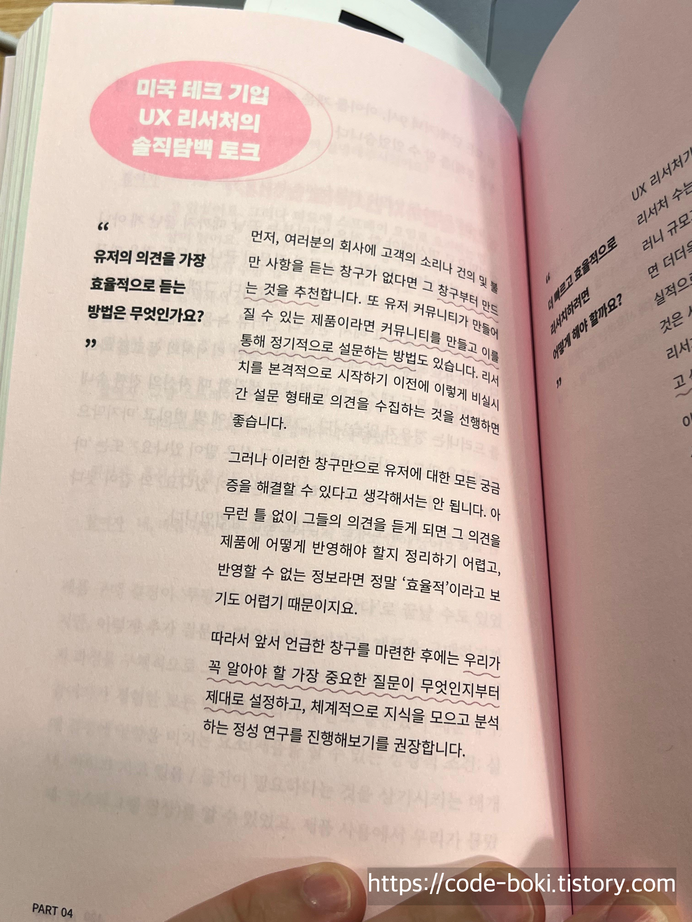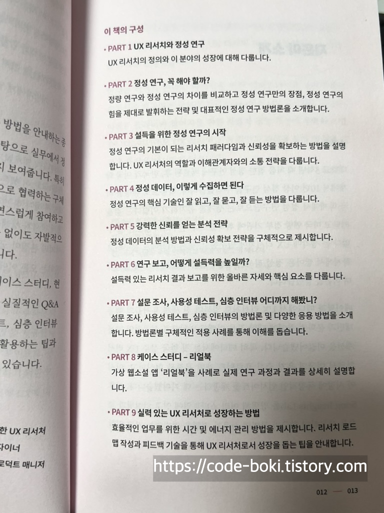 이러한 주장으로 각 Part마다 맨 앞에 질문에 대한 해답을 제시하는 것을 시작으로 그에 관한 내용들이 쭉 나오며, 맨 뒷장에는 미국 테크기업 UX 리서처의 솔직담백 토크도 나온다