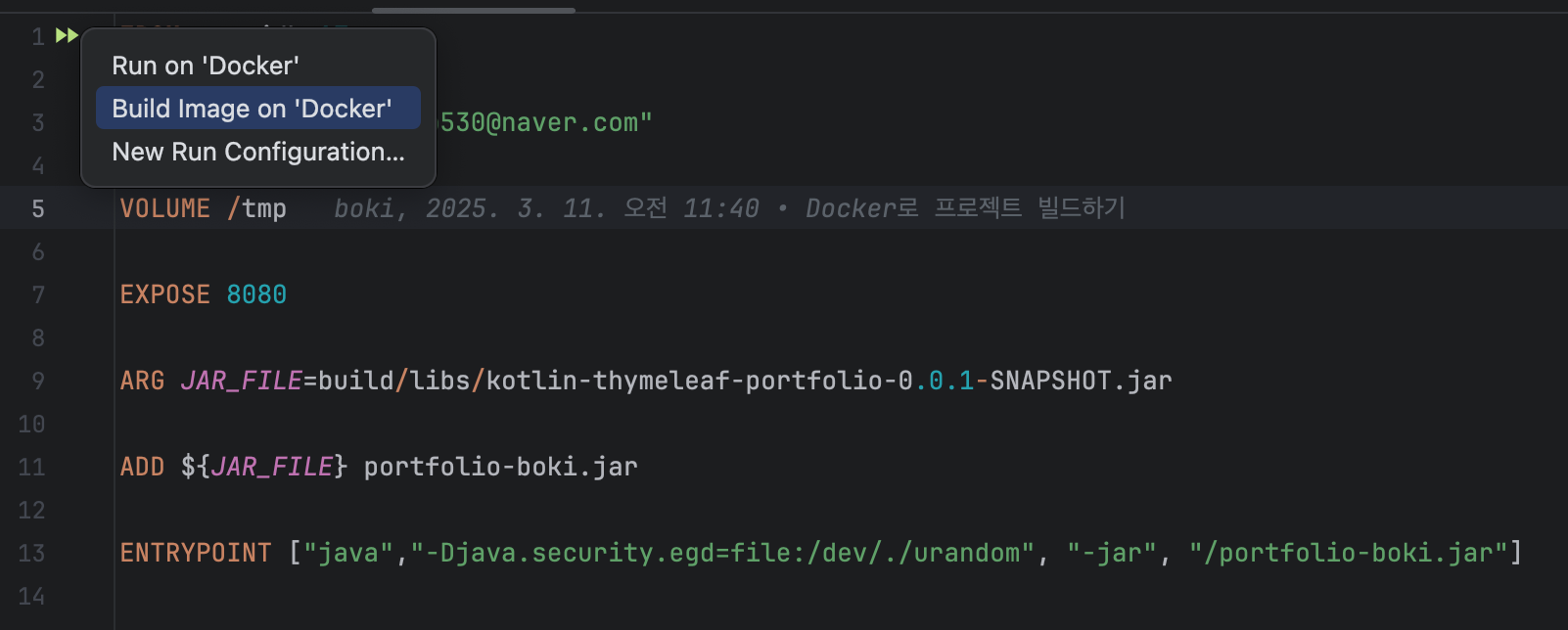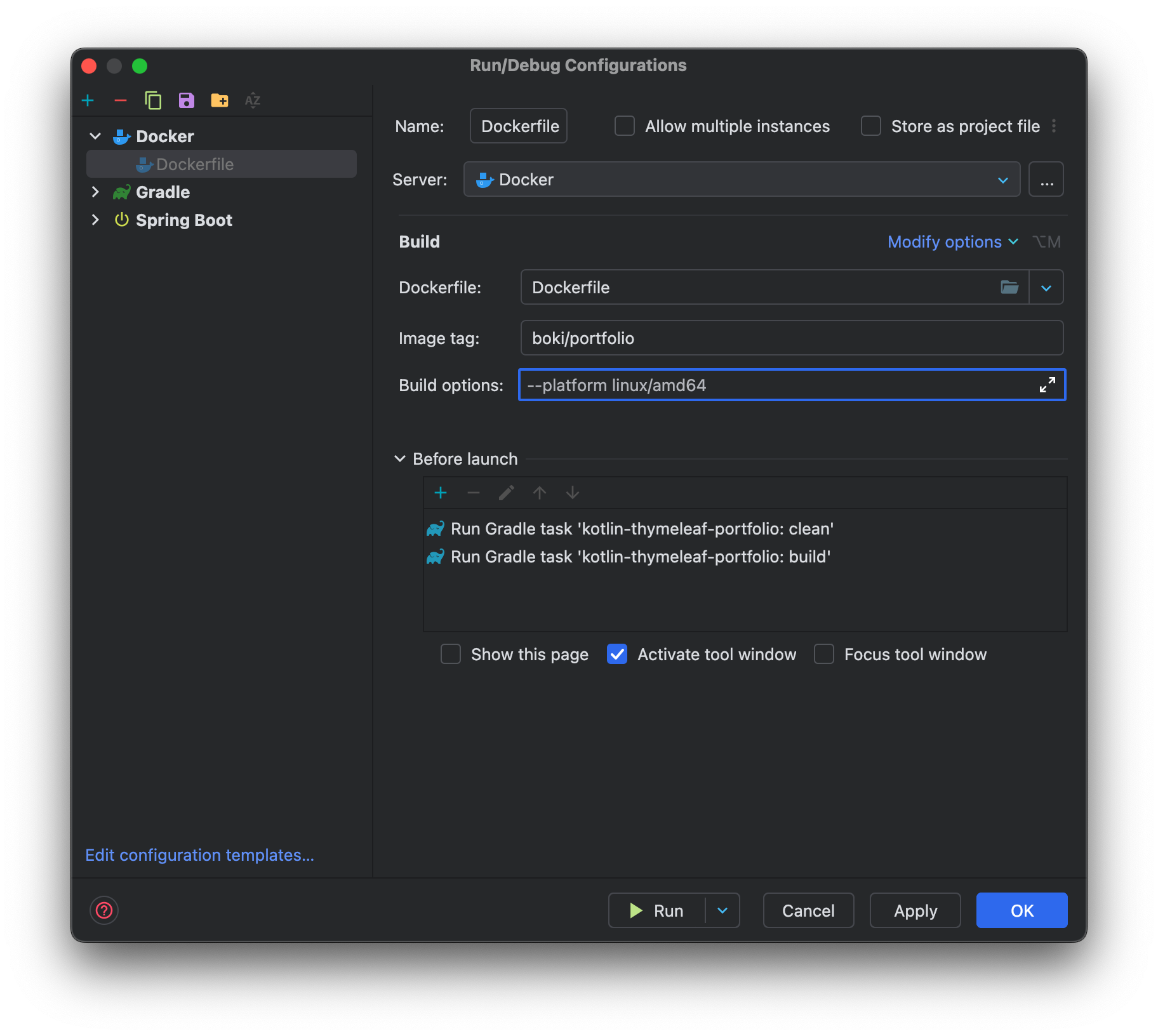 마지막으로, 거의 끝에 Docker로 빌드하고 Docker-Compose로 사용하는 부분에서 CLI보다는 UI 위주로 알려주는게 좋았다. 개인적으로 나는 docker buildx build --platform linux/amd64,linux/arm64 -t ... 를 사용하는 CLI 방식을 썼었는데 강의에서는 builx를 사용하는 것은 아니었지만, IntelliJ의 UI를 사용하는.. 정확히는 Run Configuration의 IntelliJ Docker 관련 기능을 사용하는 것이 신기했다. 도커 빌드가 실행되기전에 gradle task 2개를 추가하고, 태그를 붙이고 build option을 리눅스에서 돌아가는 환경으로 쫙 쓸 수 있는게 좋았다.