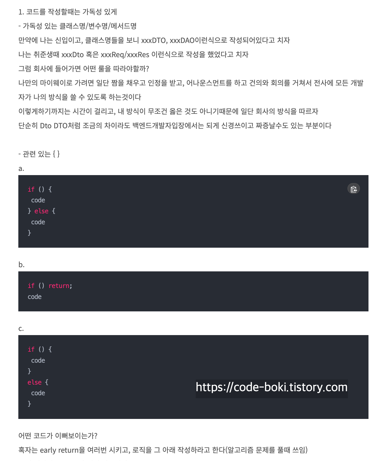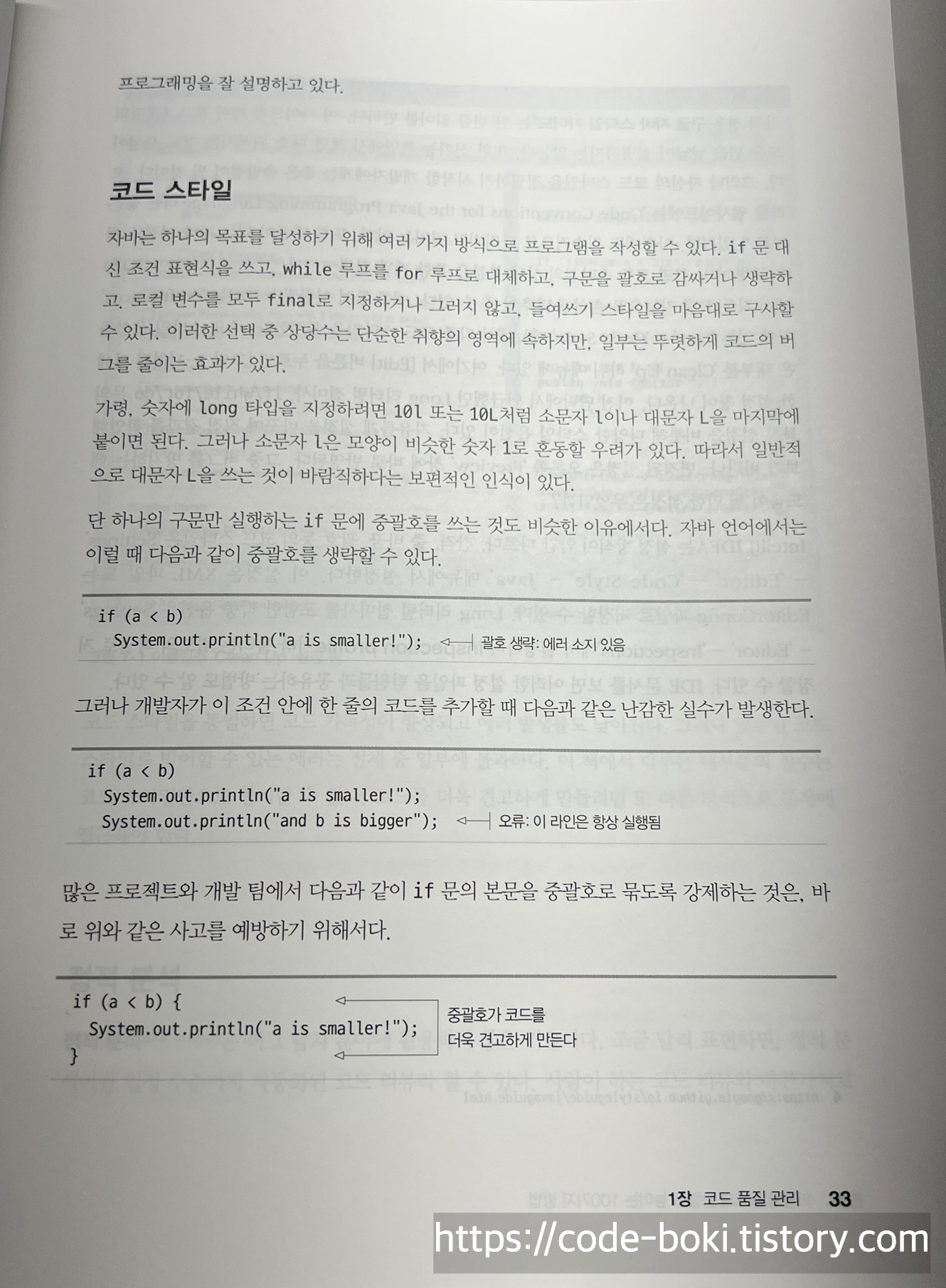 책의 코드스타일에서 나온 중괄호 부분이 내가 2022년에 작성한 코드 스타일 포스팅 글과 유사해서 기분이 좋았다.