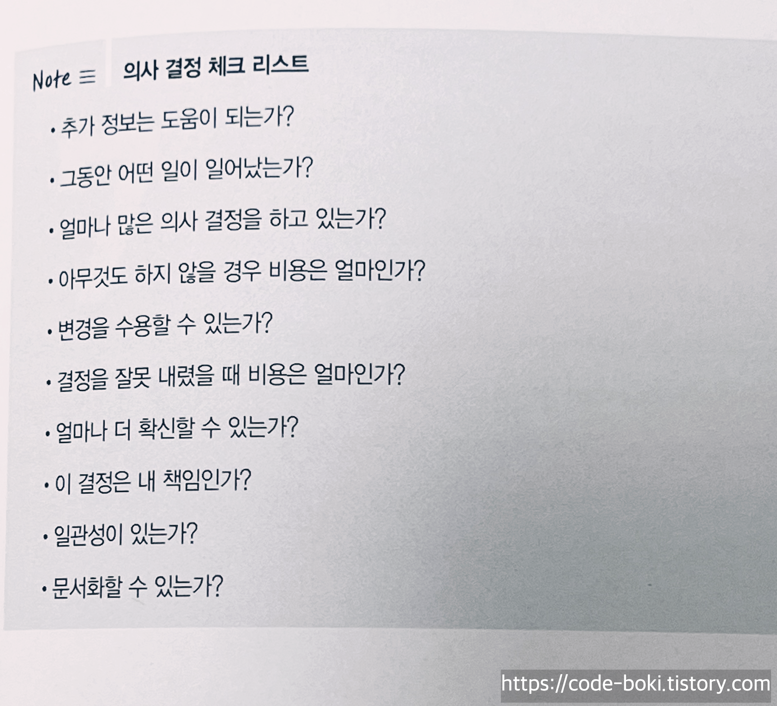 빠르게 6장 의사 결정에서 주요한 체크리스트 항목들, 7장의 실무 방식을 읽으며 많은 정보들에서 중요한 포인트를 빼낸 생각 정리를 하며 나는? 우리 팀은? 우리 회사는? 어떤 방식으로 의사 결정과 실무를 하고 있는지 되돌아봤습니다.