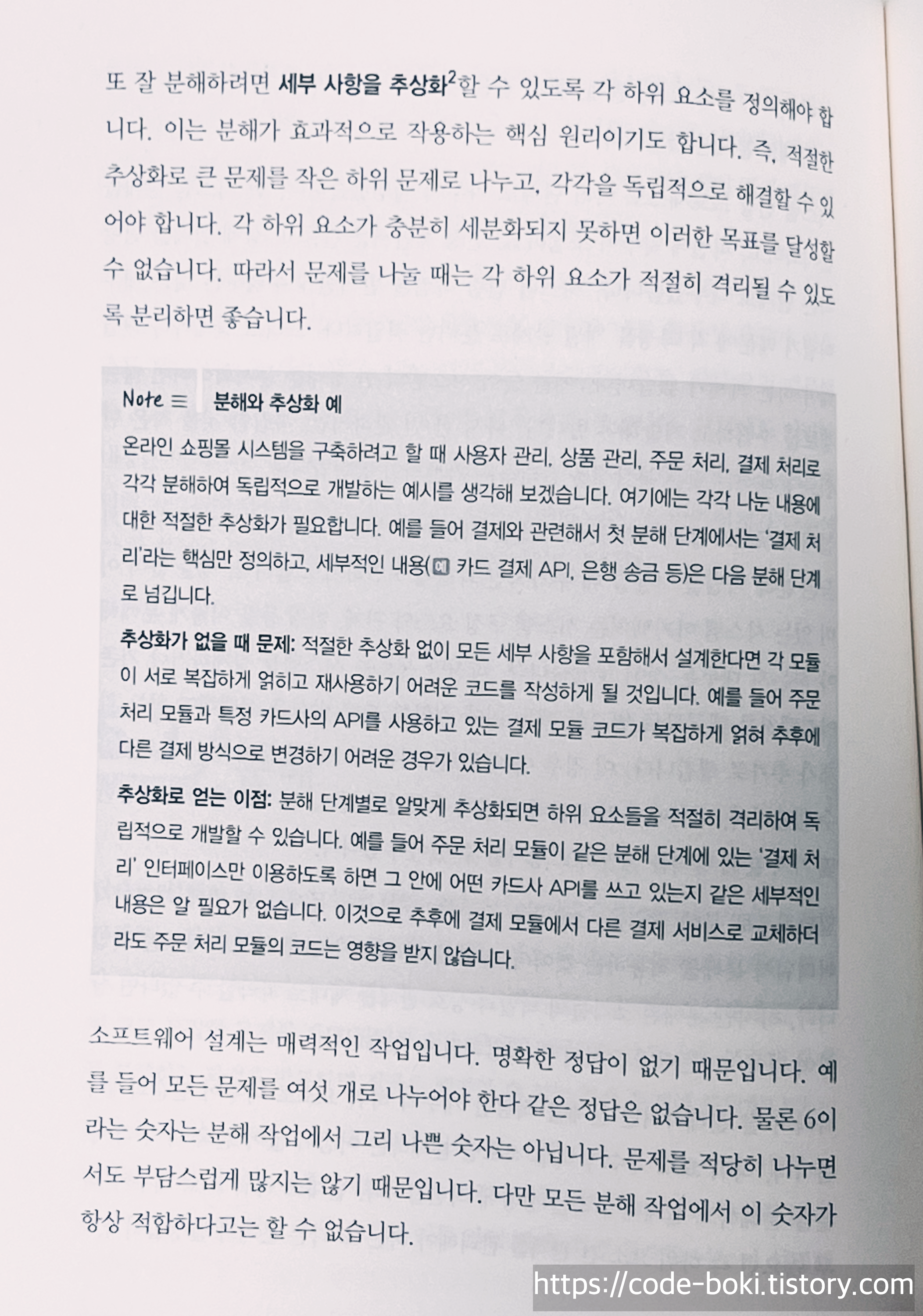 설계에서 대표적으로 나오는 용어인 분해와 추상화! 어떤 백엔드시스템은 종종 너무 과도한 추상화때문에 알아보기 힘들고 오히려 더 어렵다고들 합니다. 그렇지만 적절한 추상화는 소프트웨어를 유연하고, 추가해야되는 코드나 변경해야되는 코드를 효과적으로 줄일 수 있습니다. 모든 것은 '적절한'이 중요한 포인트인데, 이것은 매력적이게 느껴지기도 하지만 경험이 필요한 영역이기도 합니다.