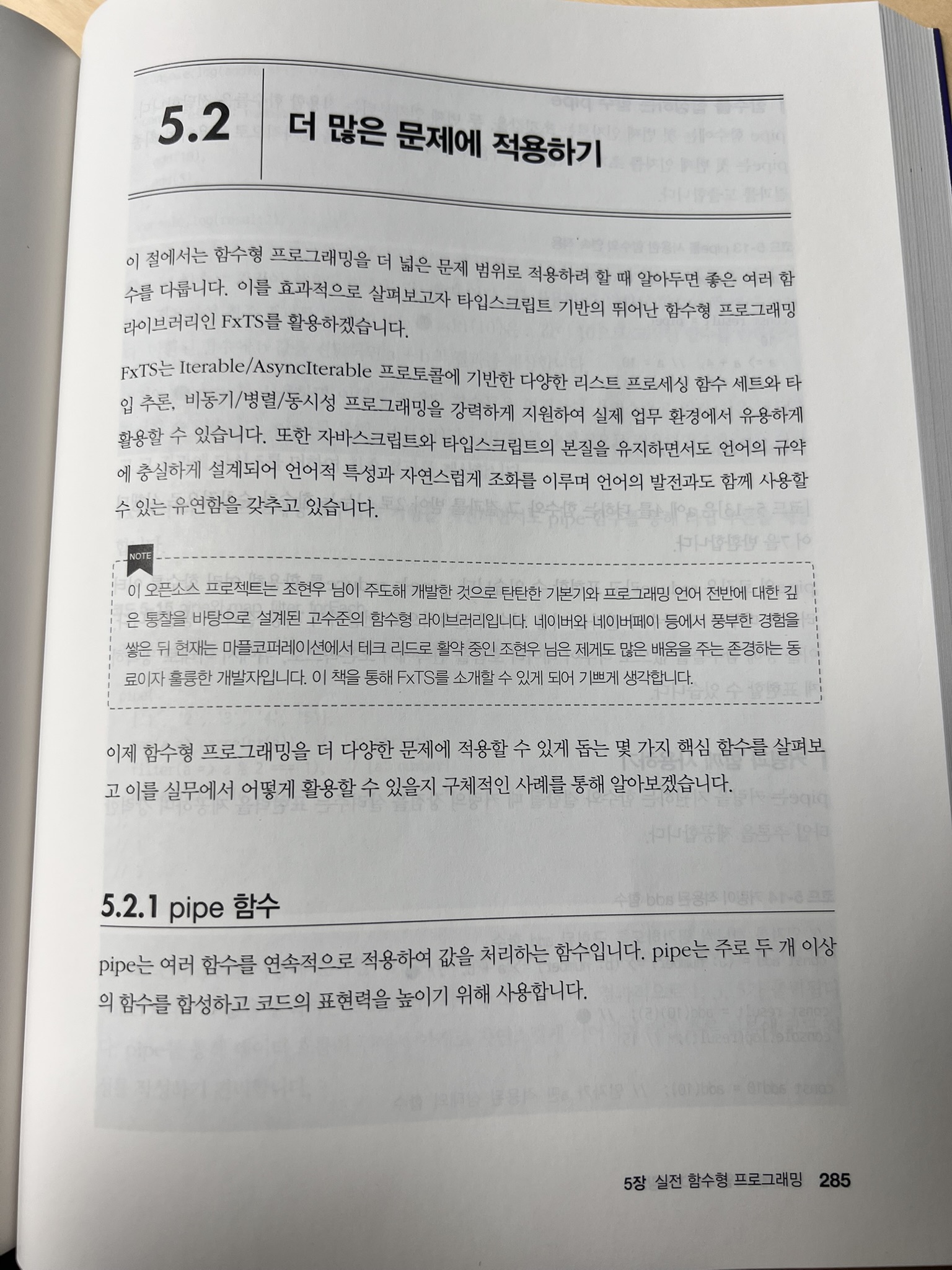 - 5장: 실전 함수형 프로그래밍에 대해서 배워본다. 함수형으로 알고리즘 문제 풀기, 백엔드 프로그래밍(스케줄러), 리스트 프로세싱 패턴화를 통해 실전 감각을 익혀본다. 이 장에서 마플코퍼레이션 현우님의 FxTS 라이브러리가 나온다! 얼마나 기쁠까.. 내 책에 같은 회사 동료분이 개발한 우리 회사의 라이브러리를 싣는 느낌은..!?