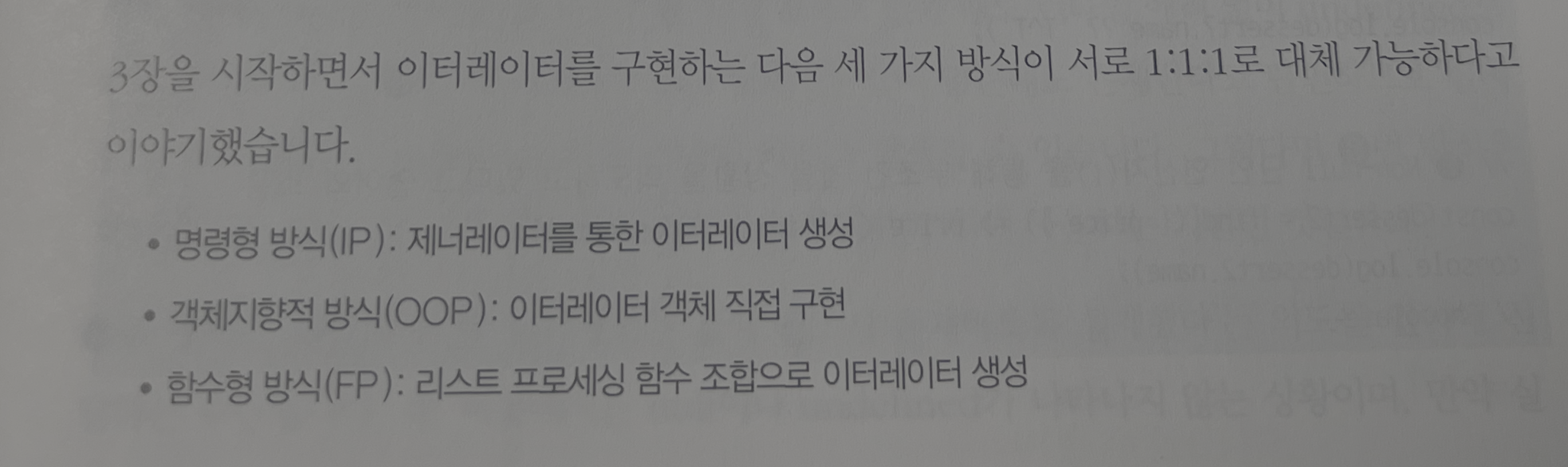 - 3장: 코드, 객체, 함수의 관계와 IP(명령형), OOP(객체지향), FP(함수형) 각각에서 어떻게 사용되는지 설명한다. 이 장에서는 하스켈 언어가 나오며 지연 평가, Generator, Iterator, 합성을 구현하고 활용하는 방법에 대해 배운다.