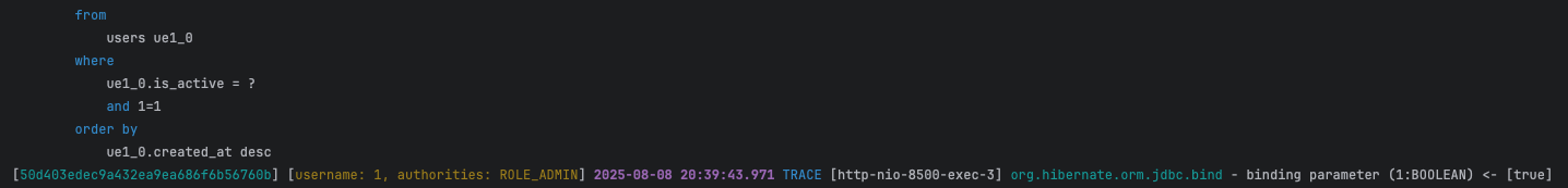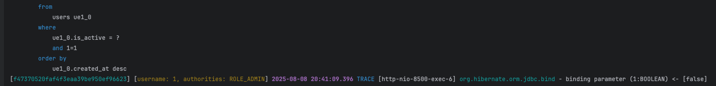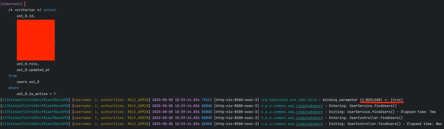 is_active = ? 이후에 바인딩된 값을 보면 true로 들어갔다.