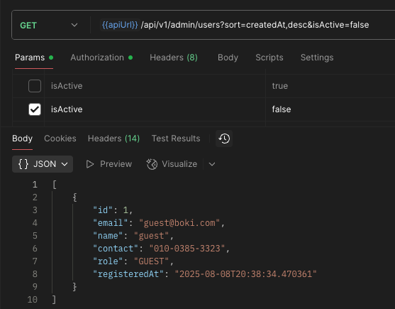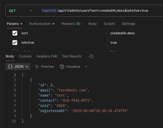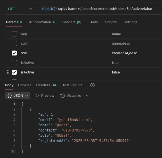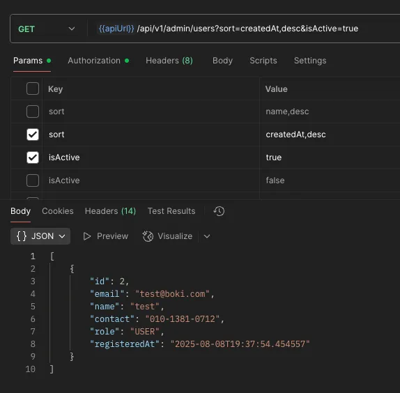 fun findUsers(isActive: Boolean): List<UserEntity>이제 예전에 작성한 이 함수가 필요 없어도 이제 관리자 권한이 필요한 API에서만 비활성화된 유저가 조회된다.