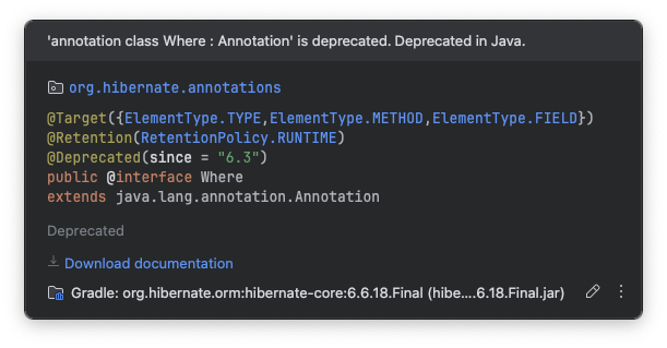 @Where 어노테이션을 예전에는 사용했지만.... 스프링 버전이 엄청 올라오면서 stater로 끌어당기는 JPA내부에 있는 Hibernate 버전도 같이 올라가서 저 어노테이션은 deprecated 되었다.