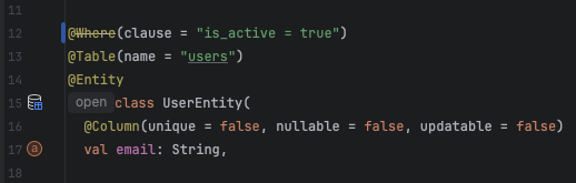 @FilterDef(name = "activeUserFilter", parameters = [ParamDef(name = "isActive", type = Boolean::class)])