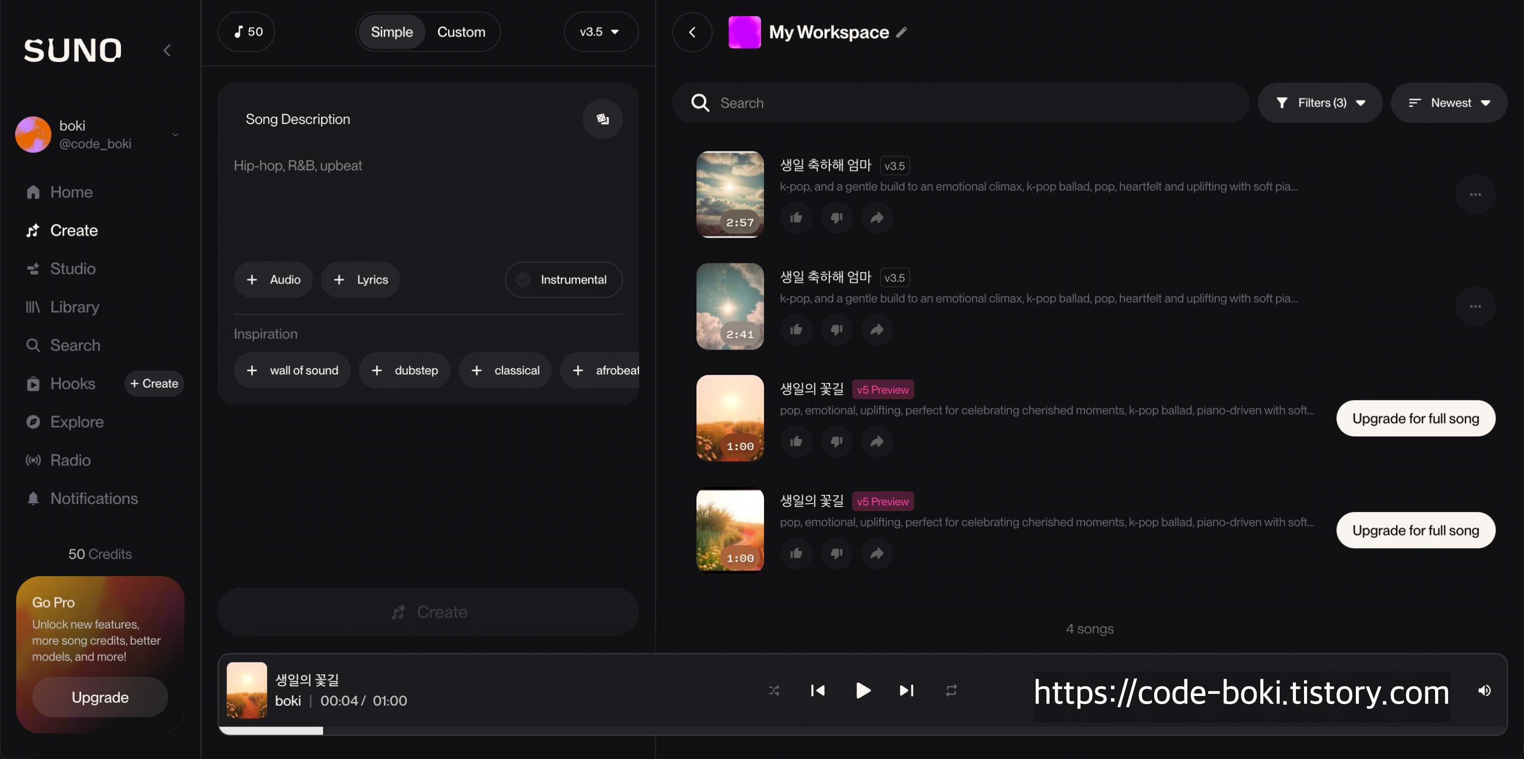 무료로 만들어주는 2가지 스타일의 노래보다는 v5 Preview가 좀 더 실제 사람 귀에 듣기 좋게 들렸지만... 진짜 만족스러운 결과물이었습니다.
