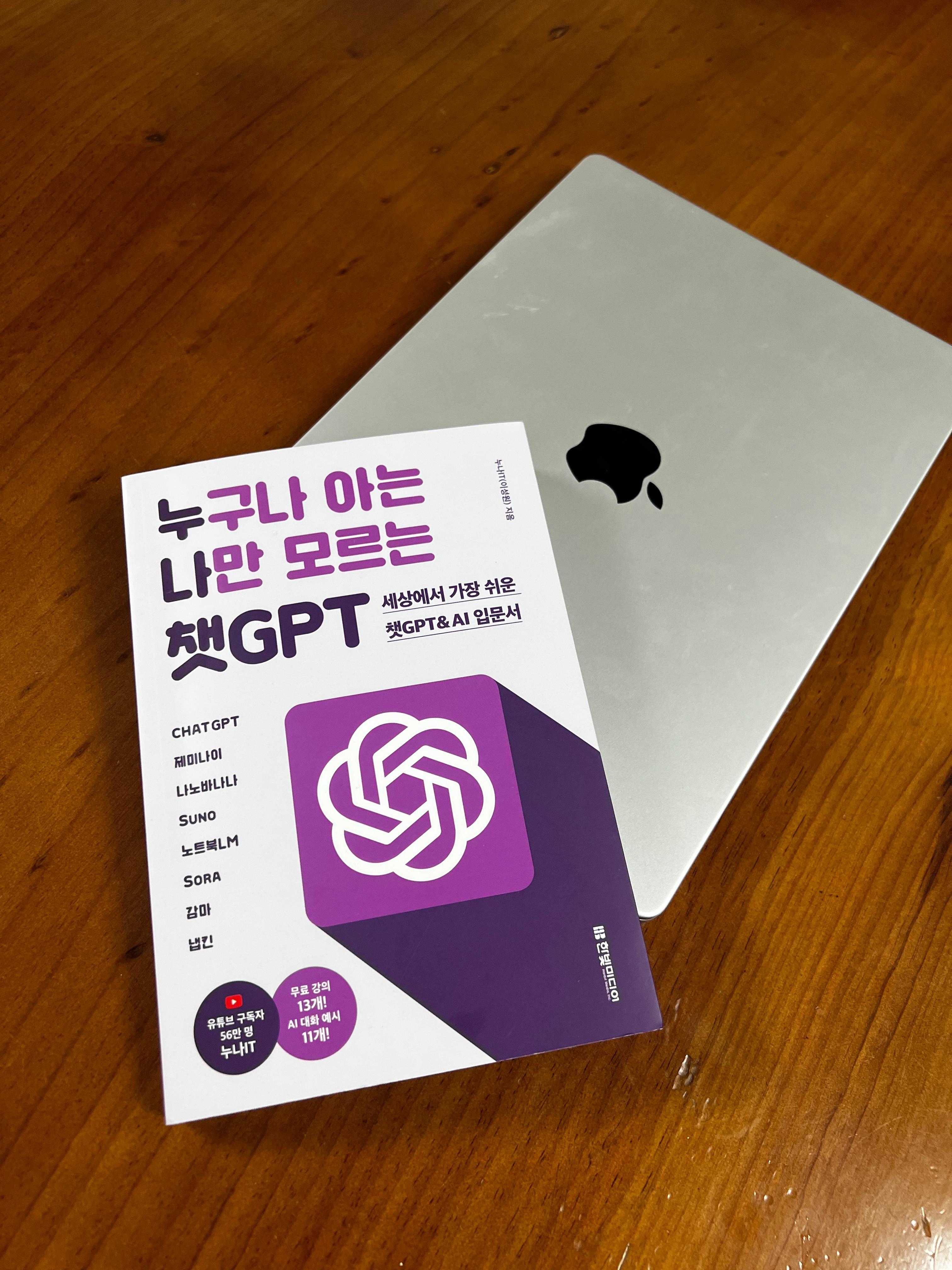 그래서 이번에는 '누구나 아는 나만 모르는 챗 GPT & AI 입문서'라는 책을 읽고, AI의 입문과 활용을 어려워하는 주변인분들에게 도움이 될까 싶어서 이 책을 선택했다.