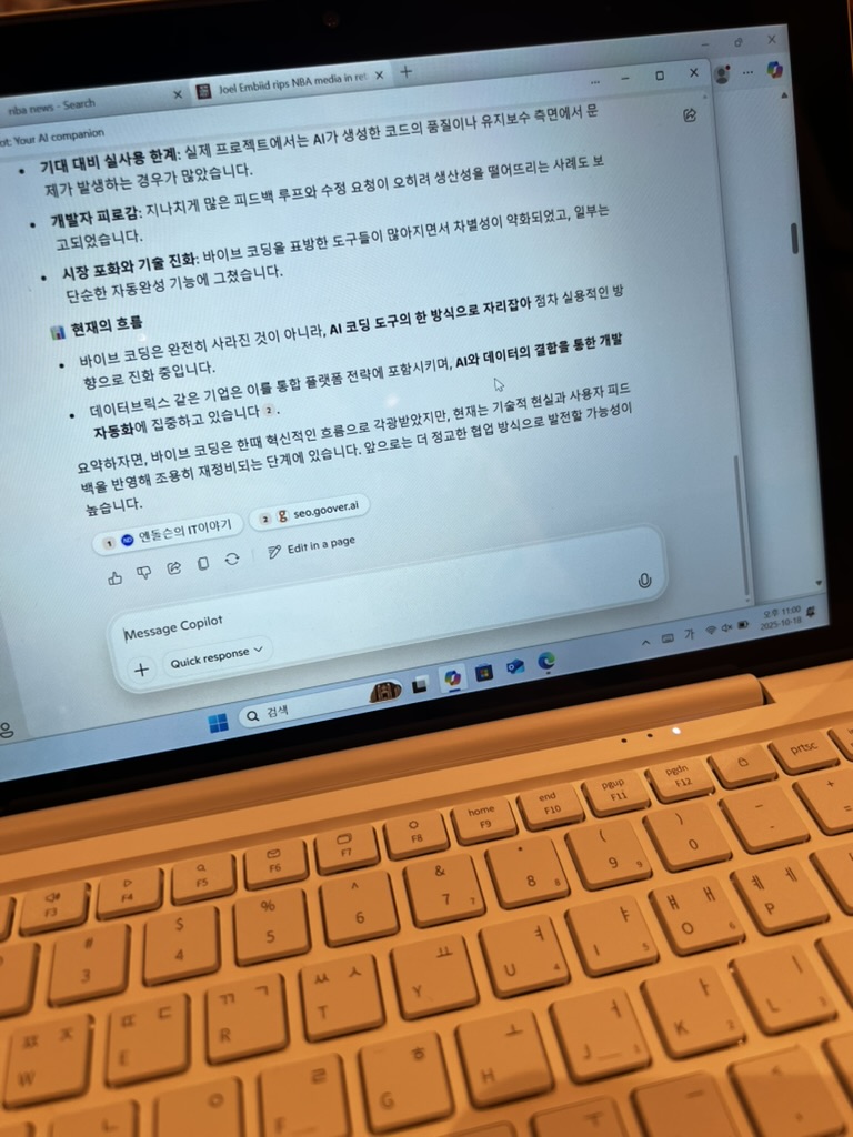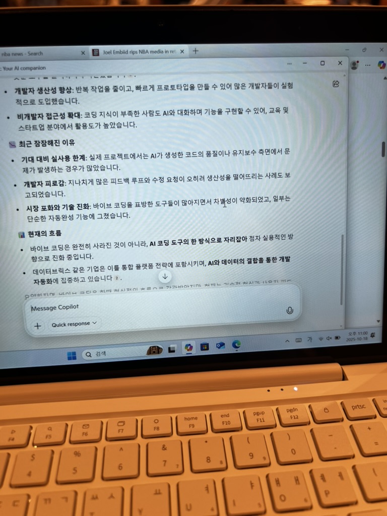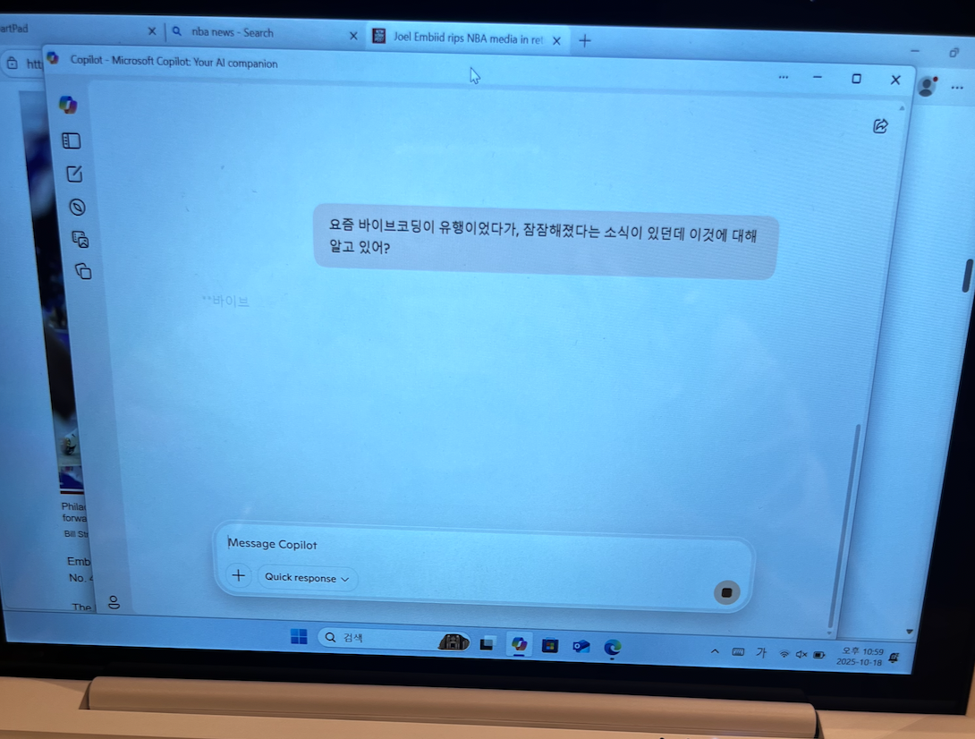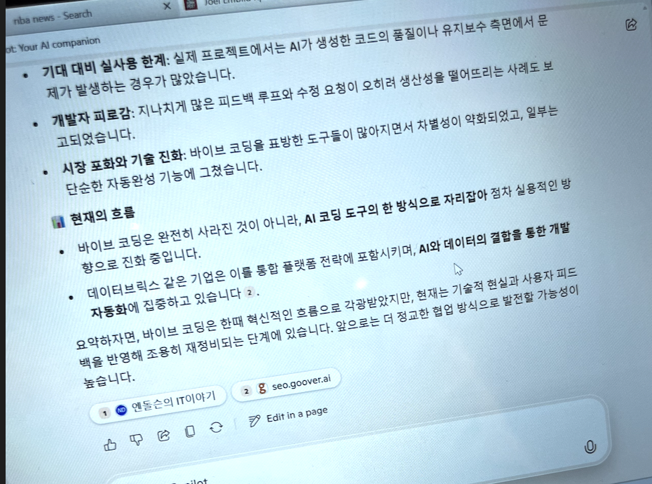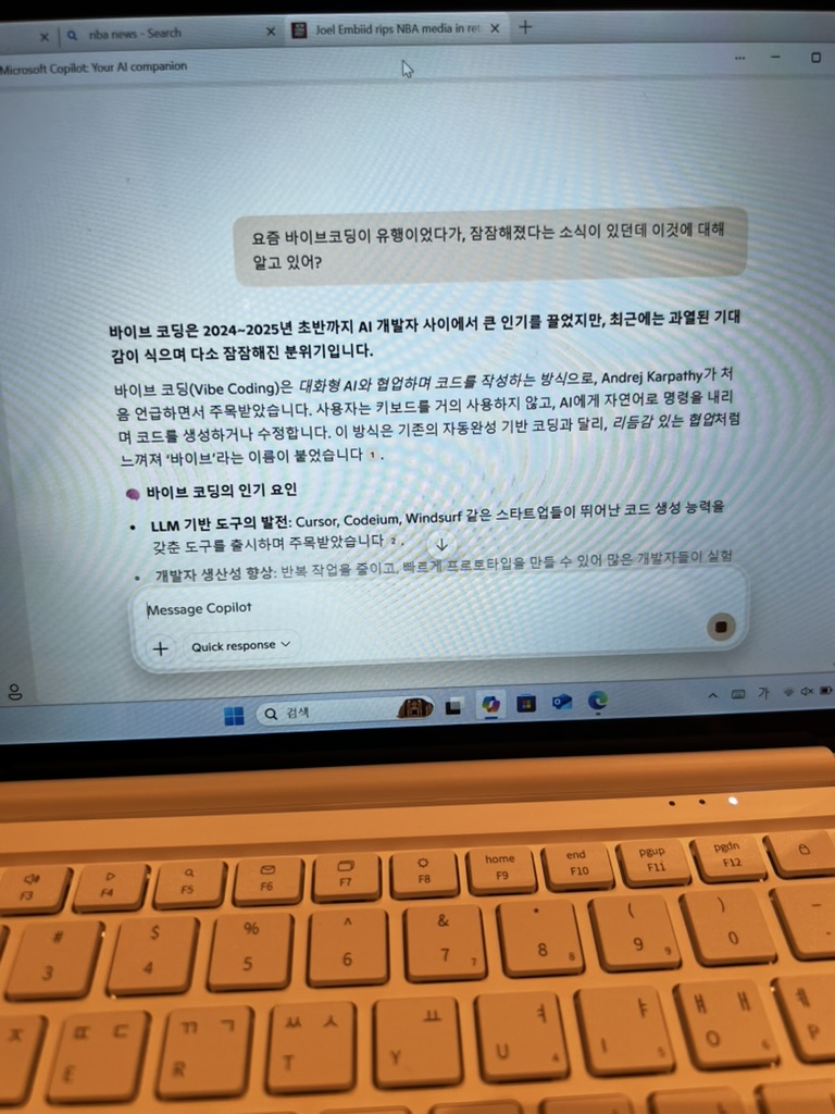 개발직군에 있는데, 여기도 유행이 엄청나게 빨리 돌아가서 바이브 코딩이라는 키워드가 HOT 했었다가 최근에는 조금 식었다고 들었다. 혹시 아는지 물어봤다.