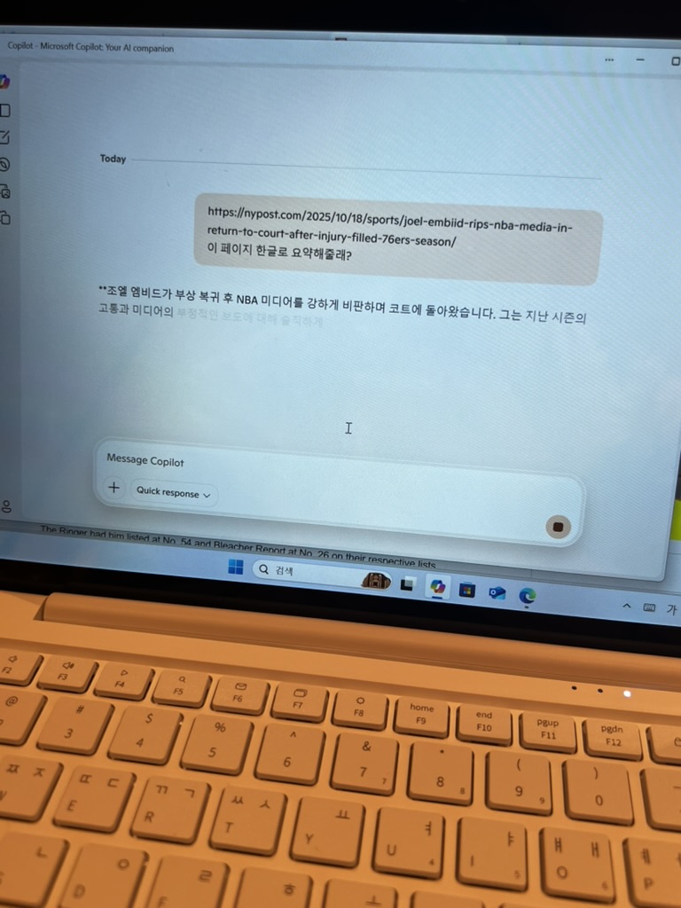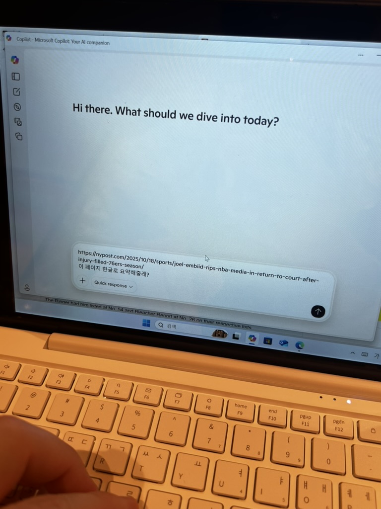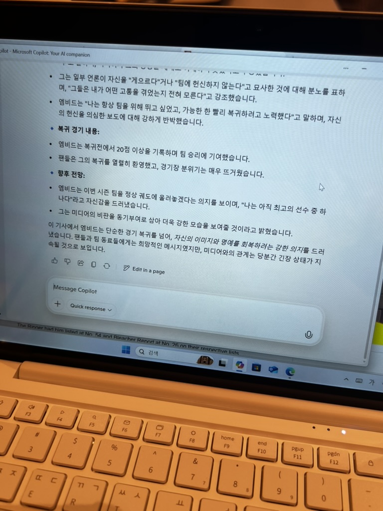 나는 곧 개막할 NBA(미국 농구 리그)를 기다리고 있고, 최근에 열리고 있는 Pre시즌 경기를 종종 보면서 영어 공부도 할 겸 해외 기사들을 찾아보며 아는 대로 읽어보고 있다. 짧은 글 같은 경우는 기타 번역기에 가져다 붙여넣기 해도 잘 알려주겠지만, 저렇게 스크롤이 엄청 긴 기사를 나처럼 공부용이 아니라 빨리 요약해서 내용을 보고 싶은 경우도 있을 수 있기에 코파일럿에 프롬프트를 맡겨봤다.