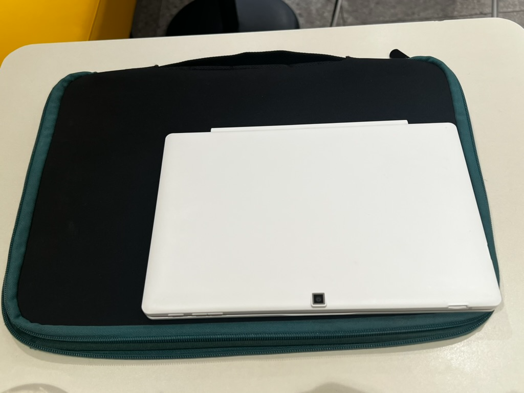 평소 넣고 다니는 노트북 파우치와 크기를 비교해 봤다. 정말 아기자기한 크기이다. 궁금해서 디스플레이와 무게를 찾아보니 화면은 10인치이고, 무게는 무려 1.18kg이라고 한다.