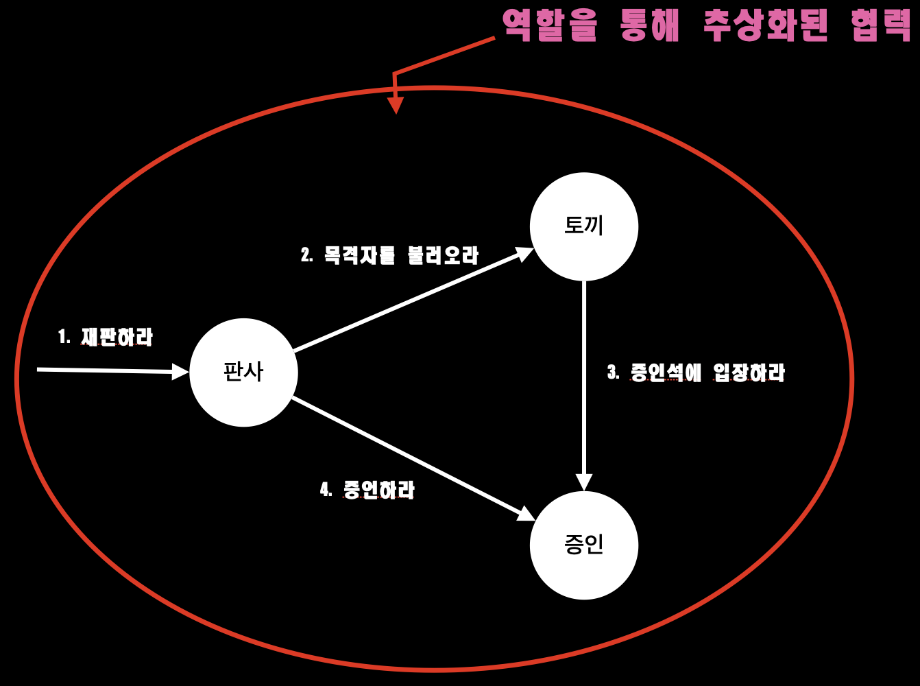 따라서 <판사>와 <증인>이라는 역할(role)을 사용하면 세 가지 협력을 모두 포괄할 수 있는 하나의 협력으로 추상화할 수 있다.