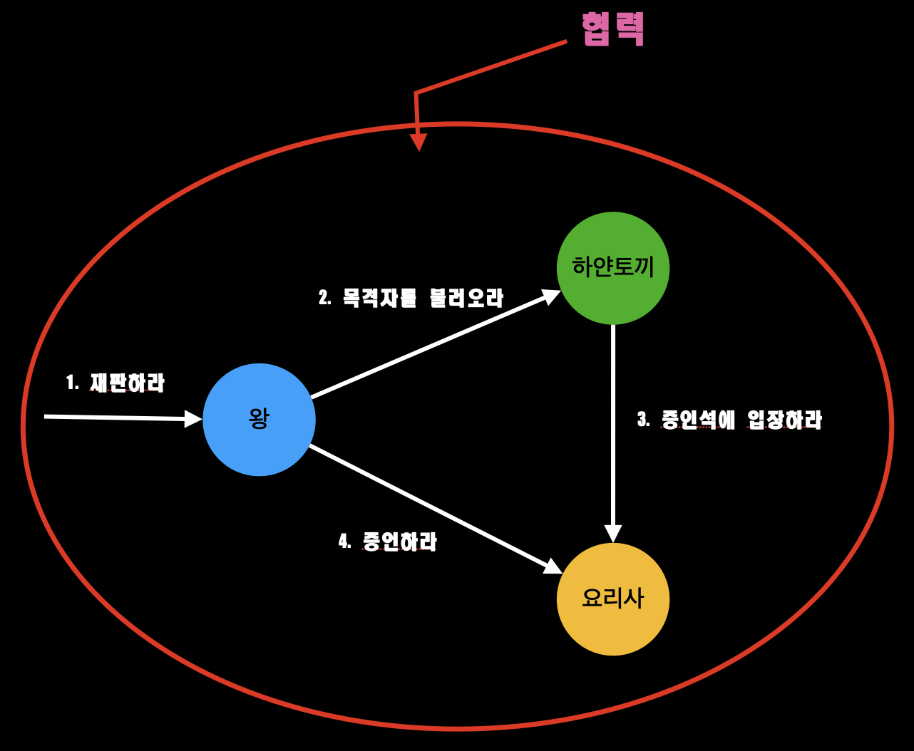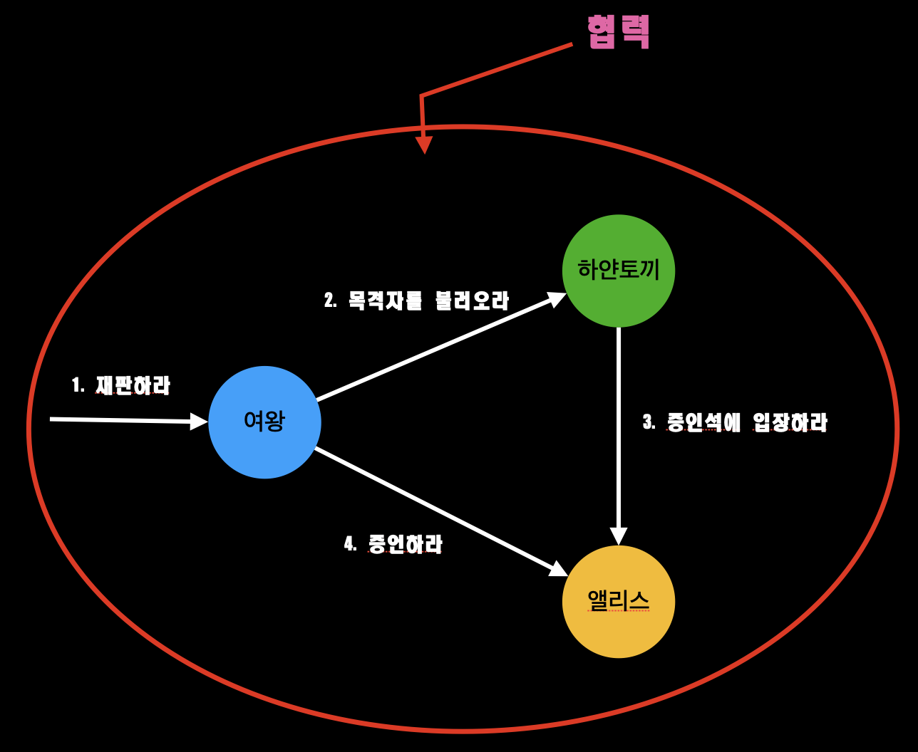 왕과 하얀 토끼, 모자 장수라고 불리는 객체들은 하트 잭을 재판하기 위해 서로 협력하고 있다. 즉, 이야기에 등장하는 객체들은 하트 잭의 재판이라는 동일한 목적을 달성하기 위해 협력하고 있는 것이다.