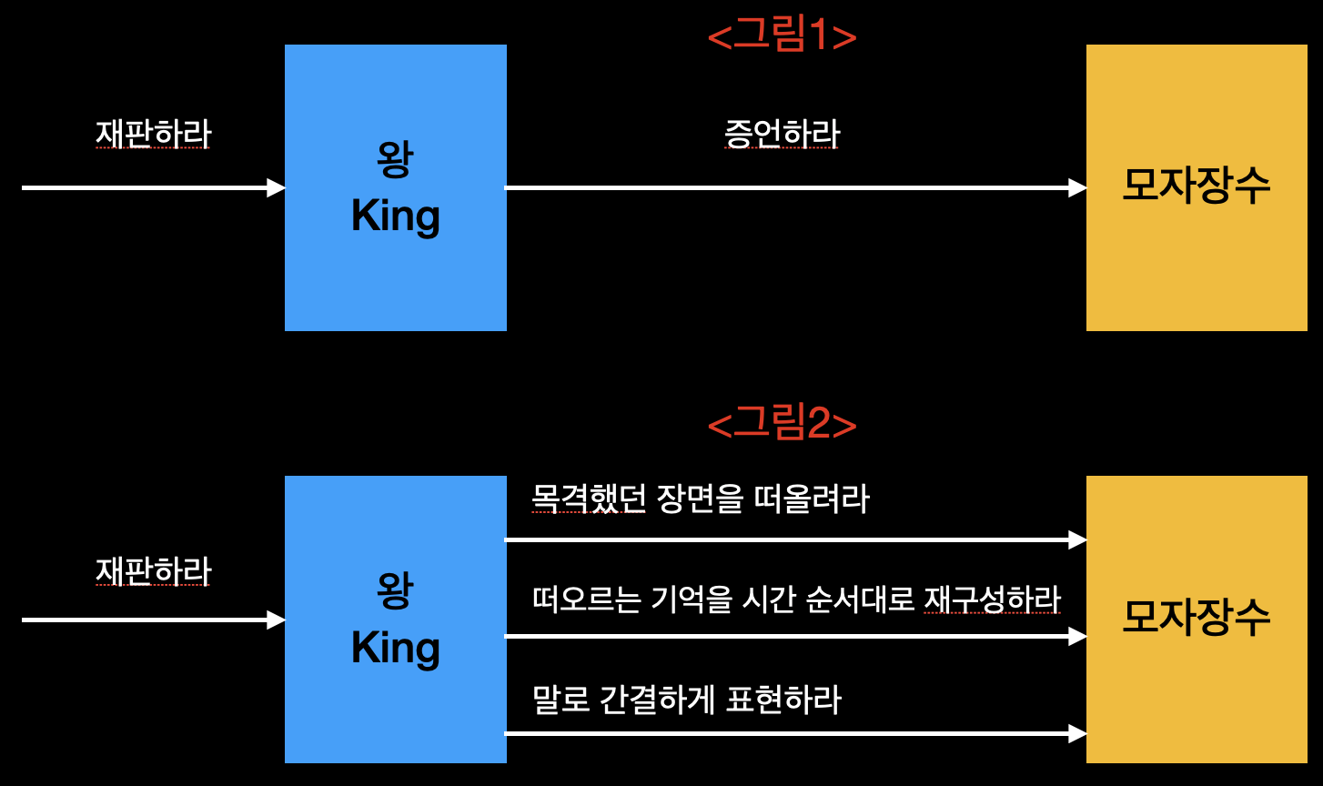 두번째 협력(그림2)에서는 왕은 '목격했던 장면을 떠올려라', '떠오르는 기억을 시간 순서대로 재구성하라', '말로 간결하게 표현하라'와 같이 좀 더 상세한 수준으로 요청한다. 여기서 문제는 이 책임들이 모자 장수가 증언하기 위해 선택할 수 있는 자유의 범위를 지나치게 제한한다는 점이다. 예를 들면 모자 장수는 목격했던 장면을머릿속으로 떠올려야 하는 책임을 지고 있기 때문에 그 날의 상황을 생생히 기록한 메모를 손에 쥐고 있더라도 이 기록을 참조할 수 없다. 상세한 수준의 책임은 증언이라는 협력의 최종 목표는 만족시킬지 몰라도, 모자 장수가 누려야 하는 선택의 자유를 크게 훼손시키고만다. 안타깝게도 두 번째 모자 장수는 책임을 수행하기 위해 자신의 의지나 판단력이 아닌 왕의 명령에 의존할 수 밖에 없다.